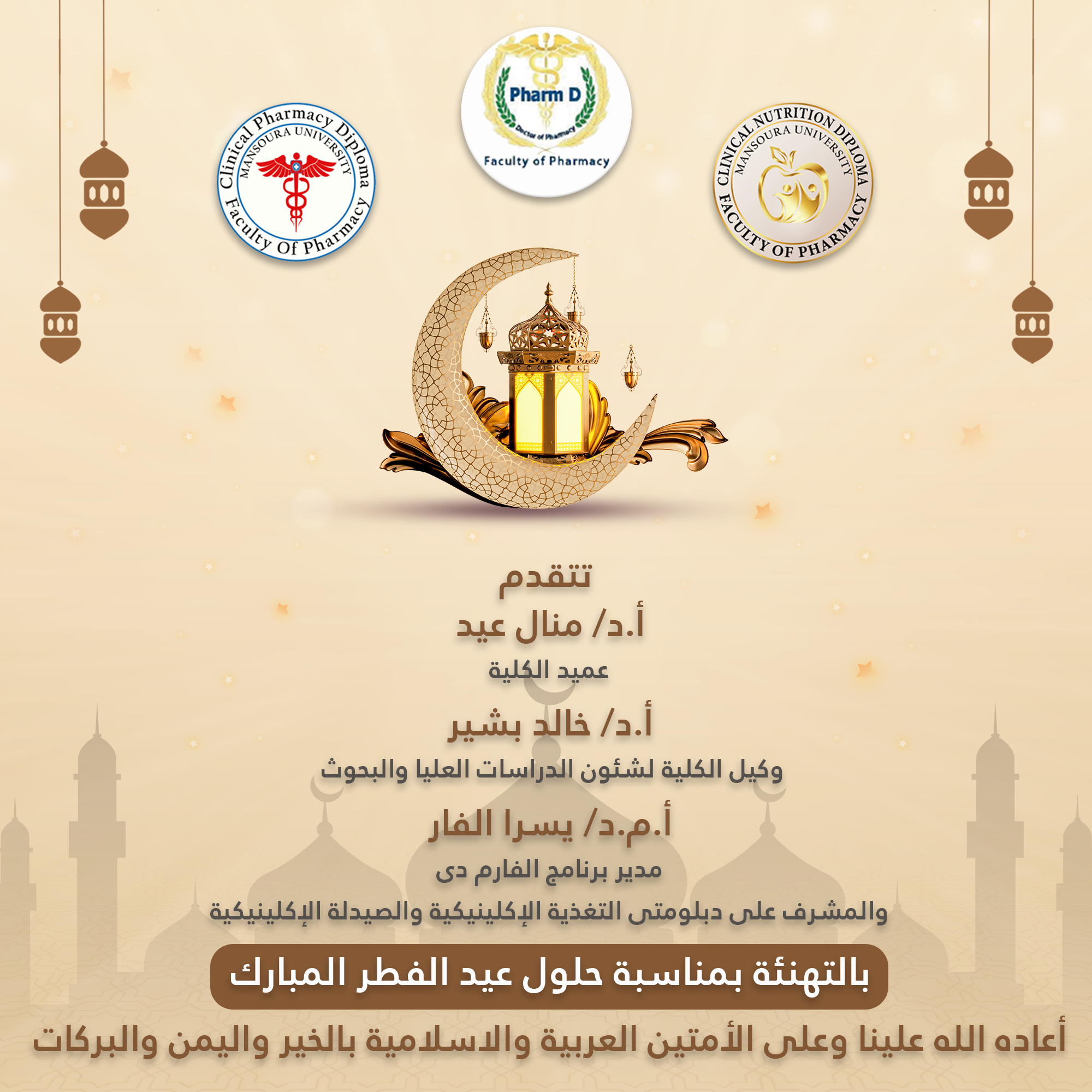 تتقدم السيدة الأستاذ الدكتور / منال عيد – عميد الكلية والسيد الأستاذ الدكتور / خالد بشير – وكيل الكلية لشئون الدراسات العليا والبحوث والسيدة الأستاذ المساعد الدكتور / يسرا الفار – مدير برنامج الفارم دى والمشرف على دبلومتى التغذية الإكلينيكية والصيدلة الإكلينيكية بأطيب التهانى والأمنيات للسادة أعضاء هيئة التدريس والهيئة المعاونة والطلاب والسادة العاملين بالكلية بمناسبة حلول عيد الفطر المبارك أعاده الله علينا وعلى الأمتين العربية والاسلامية بالخير واليمن والبركات .