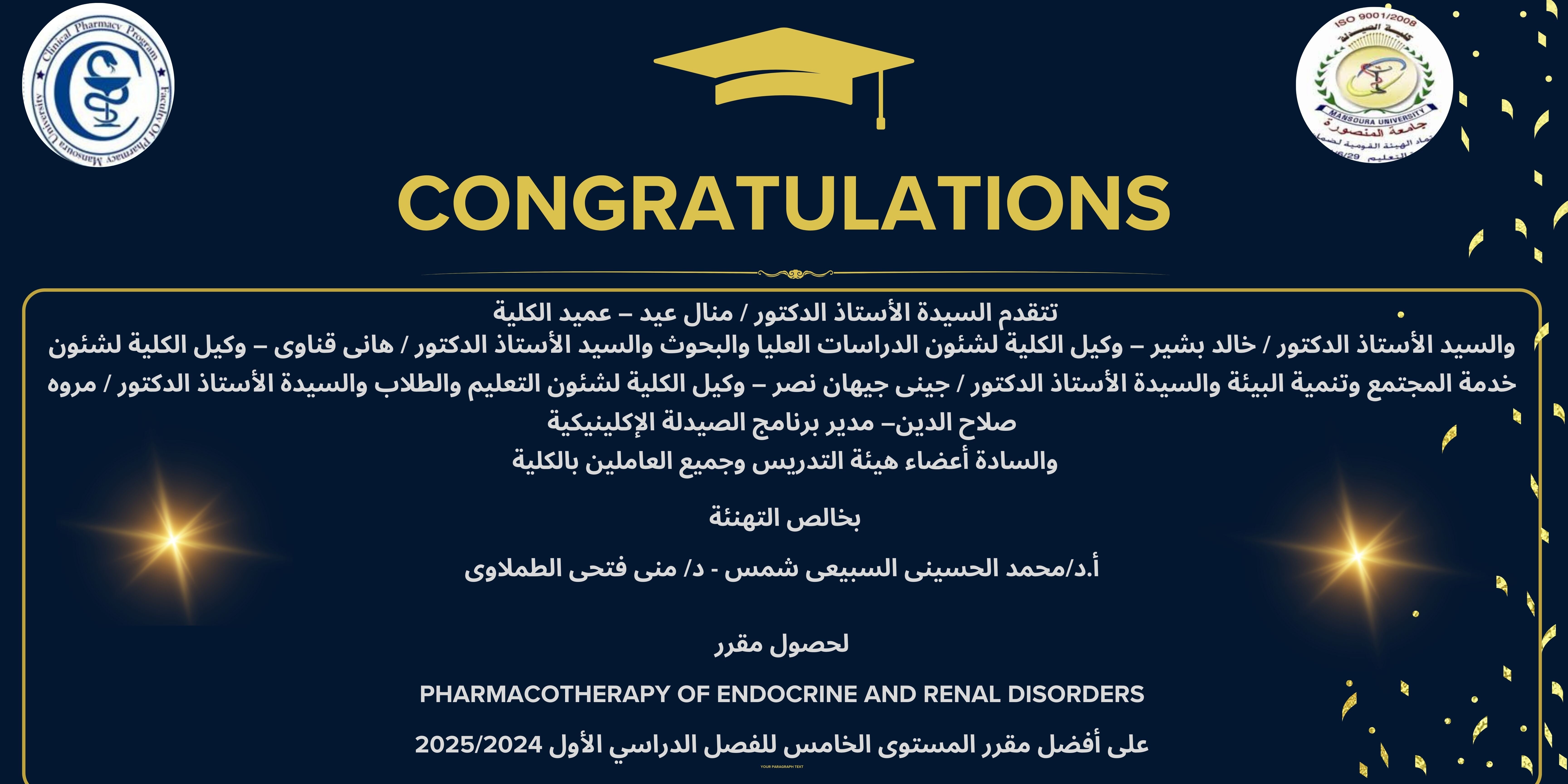 حصول مقرر Pharmacotherapy of Endocrine and Renal Disorders بالمستوى الخامس كأفضل مقرر للفصل الدراسى الأول للعام الجامعى 2024/2025