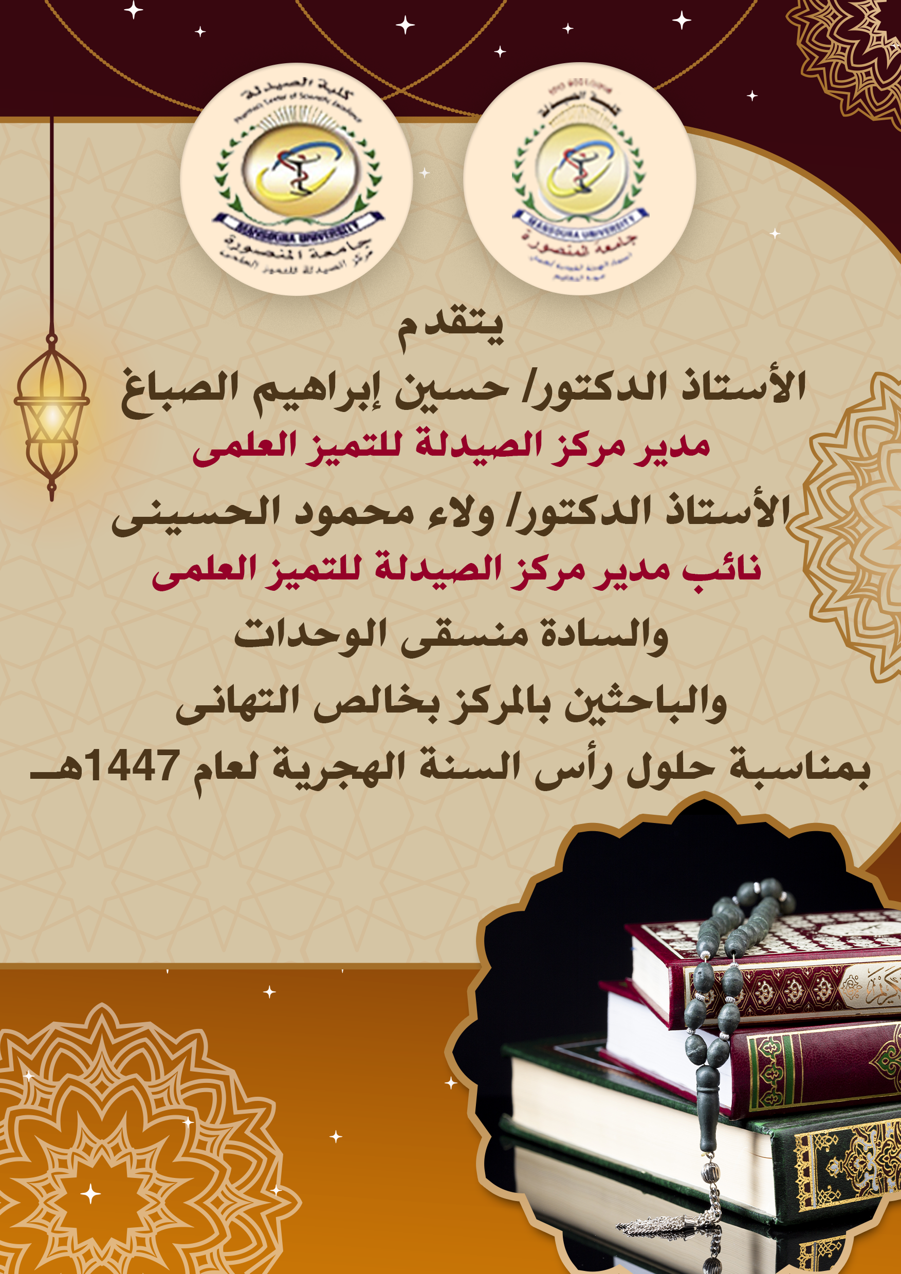 يتقدم الأستاذ الدكتور/ حسين إبراهيم الصباغ – مدير مركز الصيدلة للتميز العلمى والأستاذ الدكتور/ ولاء محمود الحسينى – نائب مدير مركز الصيدلة للتميز العلمى والسادة منسقى الوحدات والباحثين بالمركز بالتهنئة بمناسبة حلول رأس السنة الهجرية لعام 1447هــ.