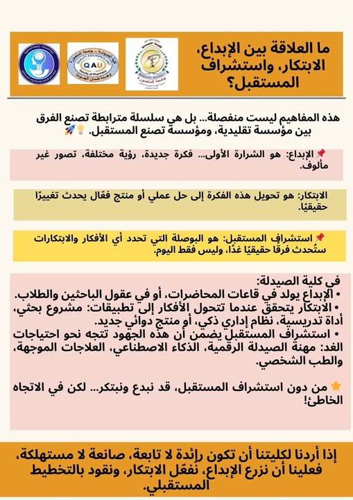 إذا أردنا لكلية الصيدلة أن تكون رائدة لا تابعة، صانعة لا مستهلكة، فعلينا أن نزرع الإبداع، نُفعّل الابتكار، ونقود بالتخطيط المستقبلي.