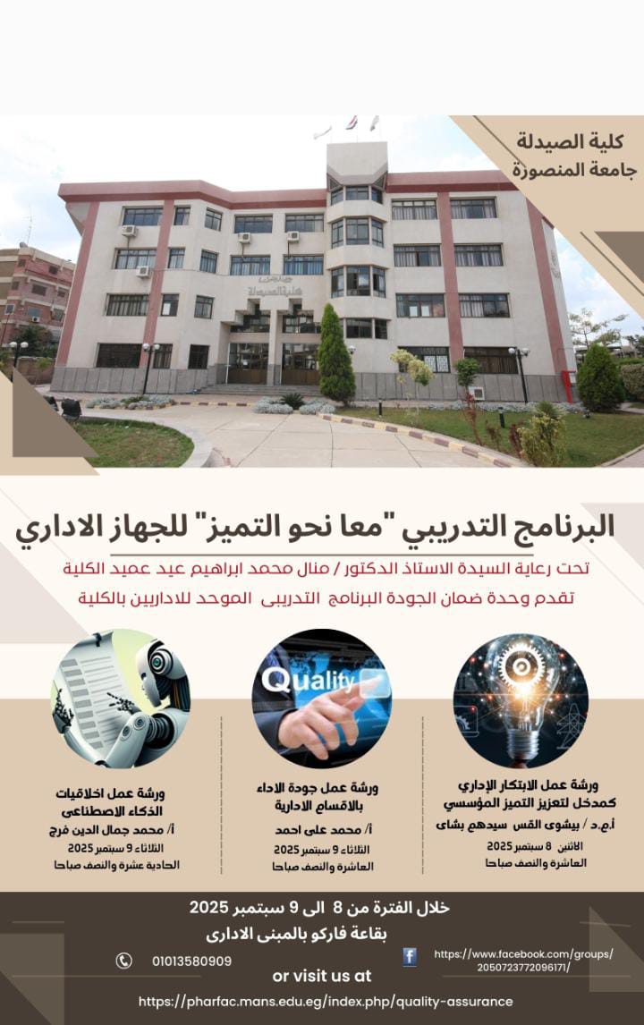وفي إطار حرص كلية الصيدلة - جامعة المنصورة على تنمية المهارات الإدارية وتعزيز القدرات الوظيفية للسادة العاملين تعلن وحدة ضمان الجودة عن فتح باب التسجيل فى البرنامج التدريبى " معا نحو التميز " للجهاز الادارى خلال الفترة من 8 الى 9 سبتمبر