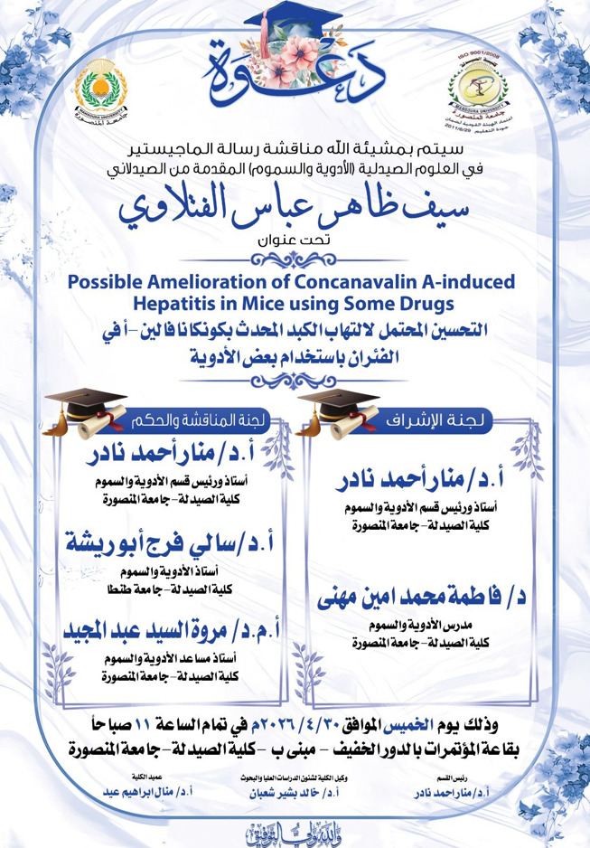 28 أبريل,2026 يارا محمد سليمان الزيارات: 237 مناقشة رسالة الماجستير فى العلوم الصيدلية (الأدوية والسموم ) المقدمة من الصيدلى/ سيف ظاهر عباس الفتلاوى الإعلان عن المناقشة السابق التالي