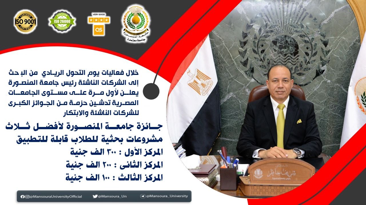 تدشين جائزة جامعة المنصورة لأفضل مشروعات بحثية طلابية قابلة للتطبيق لأول مرة على مستوى الجامعات المصرية.
