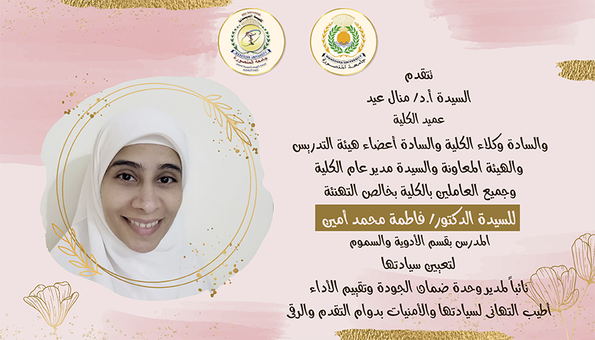 شَرُفت كلية الصيدلة بثقة السيد الأستاذ الدكتور/ شريف يوسف خاطر – رئيس جامعة المنصورة بصدور قرار تعيين السيدة الدكتور/ فاطمة محمد أمين مهنى – المدرس بقسم الأدوية والسموم بكلية الصيدلة نائباً لمدير وحدة ضمان الجودة وتقييم الأداء بالكلية.