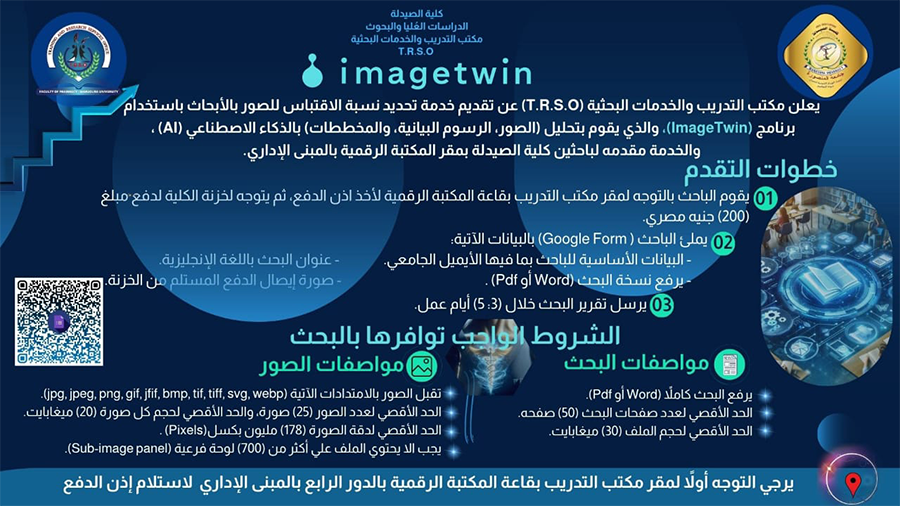 يسر مكتب التدريب والخدمات البحثية (T.R.S.O) عن تقديم خدمة جديده للباحثين بكلية الصيدلة جامعة المنصورة وهو برنامج (Imagetwin) لتحليل الصور بالذكاء الاصطناعي (AI) :