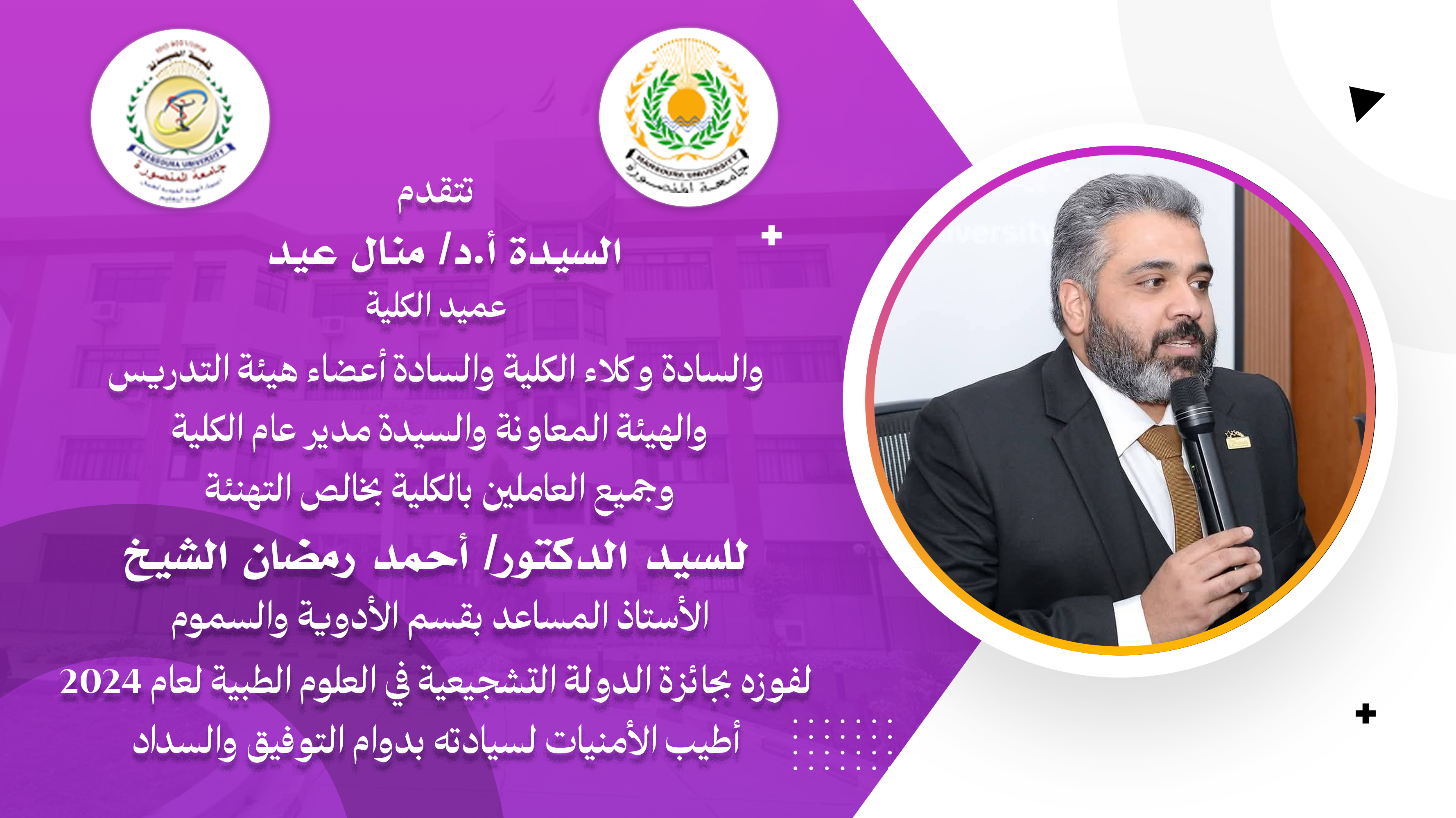 تتقدم السيدة الأستاذ الدكتور/ منال عيد – عميد الكلية والسيد الأستاذ الدكتور/ خالد بشير – وكيل الكلية لشئون الدراسات العليا والبحوث والسيد الأستاذ الدكتور/ هانى قناوى – وكيل الكلية لشئون خدمة المجتمع وتنمية البيئة والسيدة الأستاذ الدكتور/ جينى جيهان نصر – وكيل الكلية لشئون التعليم والطلاب والسادة أعضاء هيئة التدريس والهيئة المعاونه والسيدة/ أمل عبد الجواد – مديرعام الكلية وجميع العاملين بالكلية بخالص التهنئة للسيد الدكتور/ أحمد رمضان الشيخ – الأستاذ المساعد بقسم الأدوية والسموم وذلك لفوزه بجائزة الدولة التشجيعية في العلوم الطبية لعام 2024