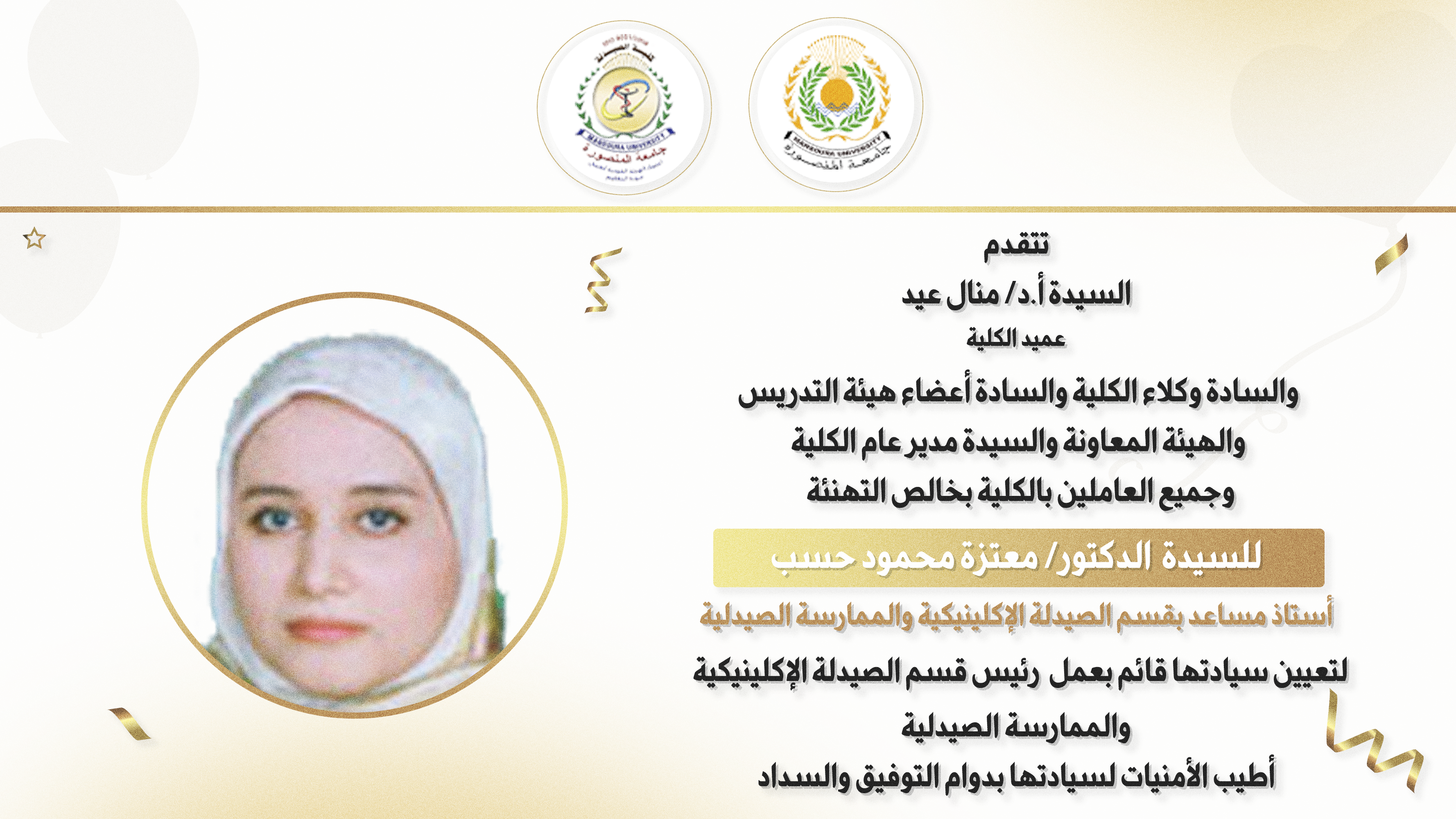شَرُفت كلية الصيدلة بثقة معالي السيد الأستاذ الدكتور/ شريف خاطر - رئيس جامعة المنصورة بتعيين السيدة الدكتور/ معتزة محمود حسب - الأستاذ المساعد بقسم الصيدلة الإكلينيكة والممارسة الصيدلية - قائم بعمل رئيساً لمجلس القسم بالكلية.