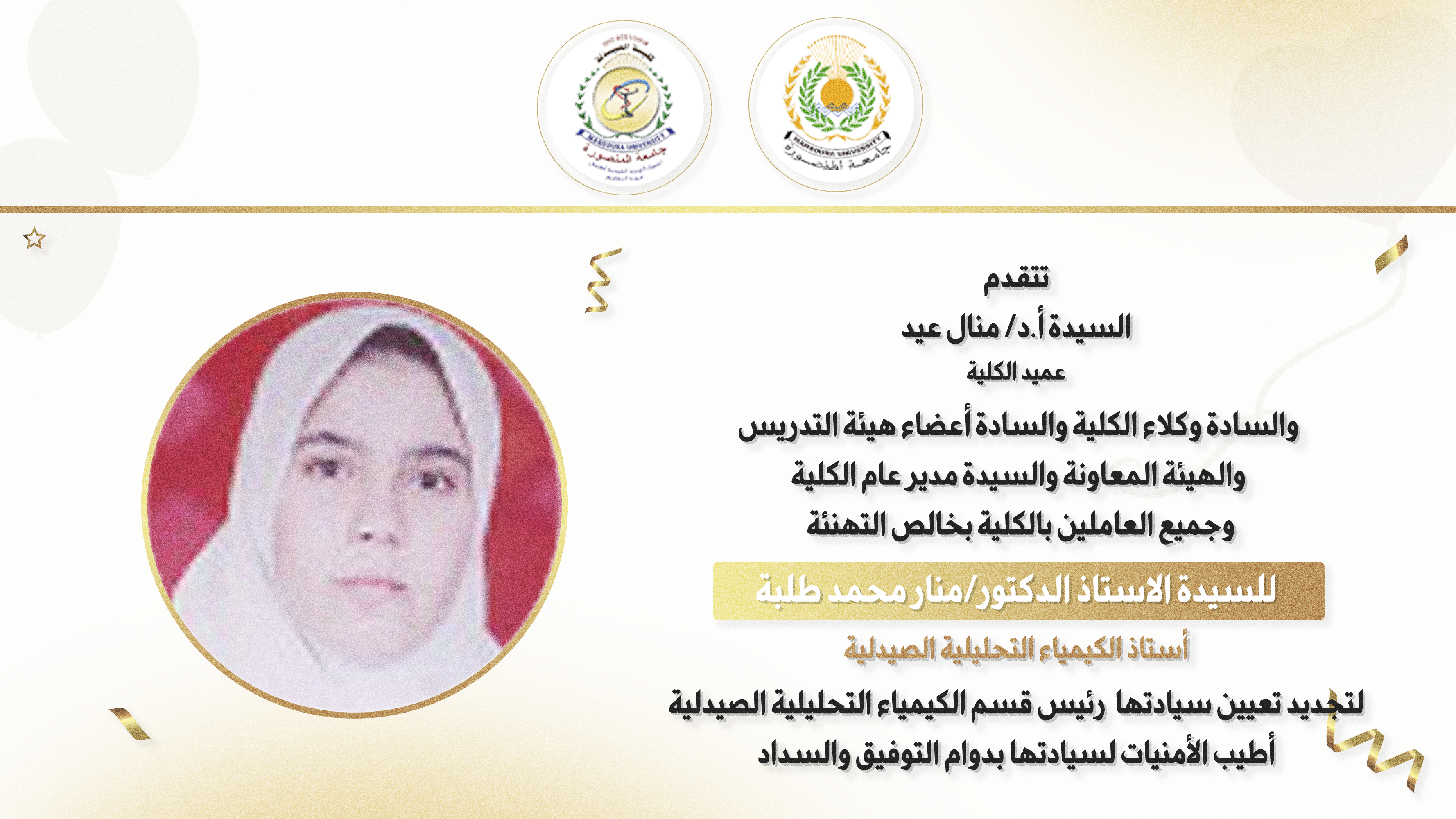 شَرُفت كلية الصيدلة بثقة معالي السيد الأستاذ الدكتور/ شريف خاطر - رئيس جامعة المنصورة بتجديد تعيين السيدة الأستاذ الدكتور/ منار محمد طلبة - أستاذ الكيمياء التحليلية الصيدلية - رئيساً لمجلس القسم بالكلية.