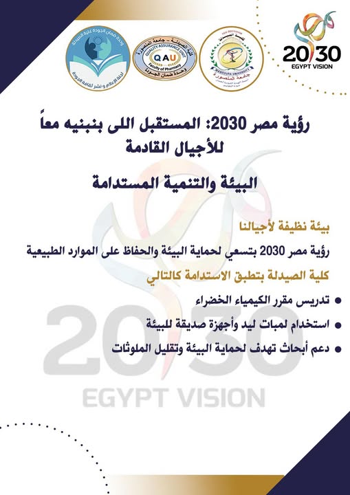 17 أغسطس,2025 رؤية مصر 2030: المستقبل اللي بنبنيه معًا البيئة والتنمية المستدامة رؤية مصر 2030: المستقبل اللي بنبنيه معًا البيئة والتنمية المستدامة "بيئة نظيفة لأجيالنا" رؤية مصر 2030 بتسعي لحماية البيئة والحفاظ على الموارد الطبيعية. كلية الصيدلة بتطبق الاستدامة كالتالي: تدريس مقرر الكيمياء الخضراء استخدام لمبات ليد وأجهزة صديقة للبيئة دعم أبحاث تهدف لحماية البيئة وتقليل الملوثات السابق التالي