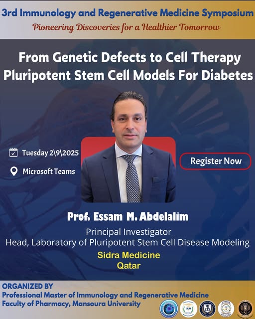 We are thrilled to announce the participation of a distinguished scientific figure, Professor Essam Abdelalim, Principal Investigator at Sidra Medicine, Qatar, and former Senior Scientist at the Qatar Biomedical Research Institute (QBRI), at our upcoming 3rd Immunology and Regenerative Medicine Symposium !