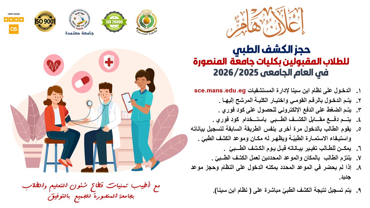 25 أغسطس,2025 يارا محمد سليمان الزيارات: 322 إعلان هام بدء حجز الكشف الطبي للطلاب الجدد المقبولين بكليات جامعة المنصورة في العام الجامعى 2026/2025 أولا : الدخول على موقع حجز الكشف الطبى https://sce.mans.edu.eg/ واتباع الخطوات الموجودة بالصورة مع أطيب تمنياتنا بالتوفيق السابق التالي