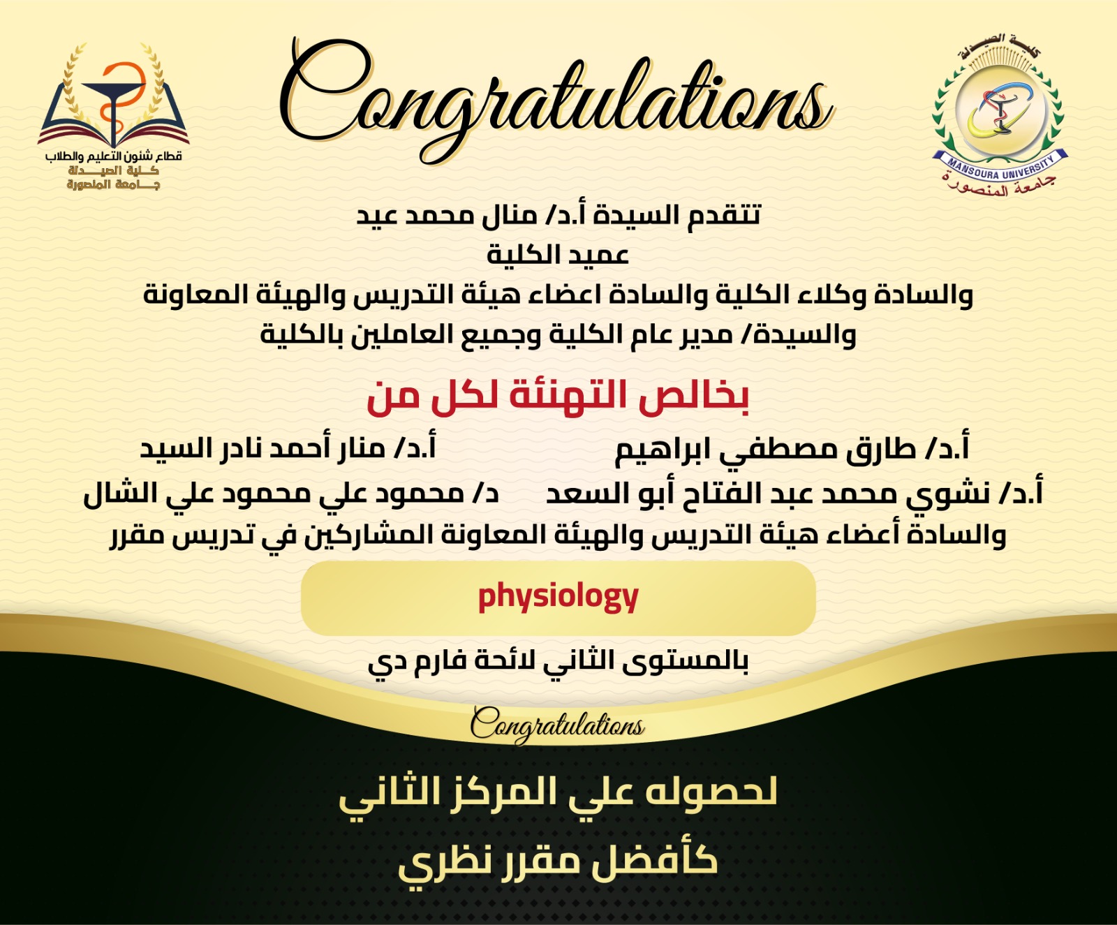 حصول مقرر physiologyعلى المركز الثانى كأفضل مقرر نظري