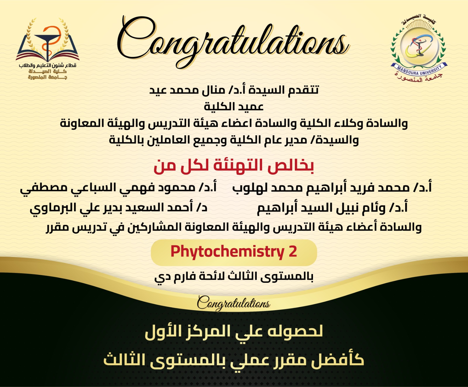 08 سبتمبر,2025 حصول مقرر Phytochemistry 2 علي المركز الأول كأفضل مقرر عملي بالمستوى الثالث السابق التالي