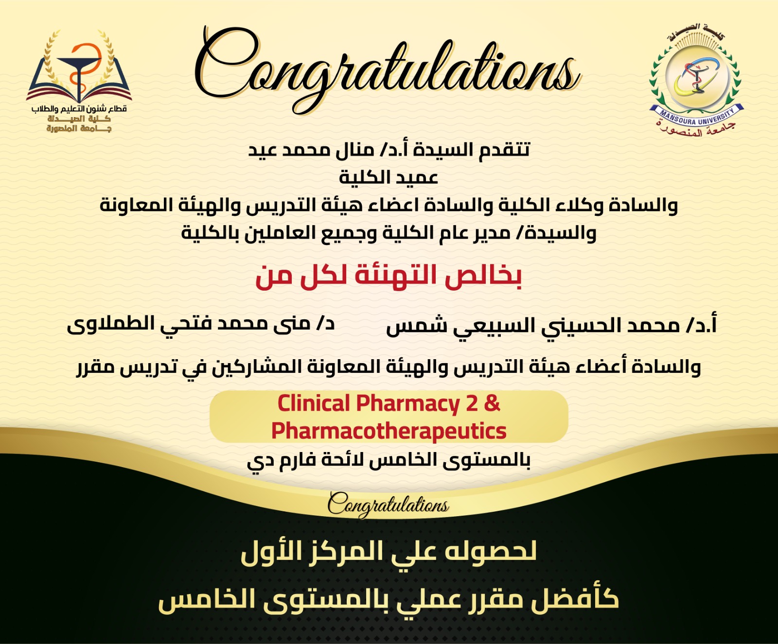 08 سبتمبر,2025 حصول مقرر Clinical Pharmacy 2 & Pharmacotherapeutics علي المركز الأول كأفضل مقرر عملي بالمستوى الخامس السابق التالي