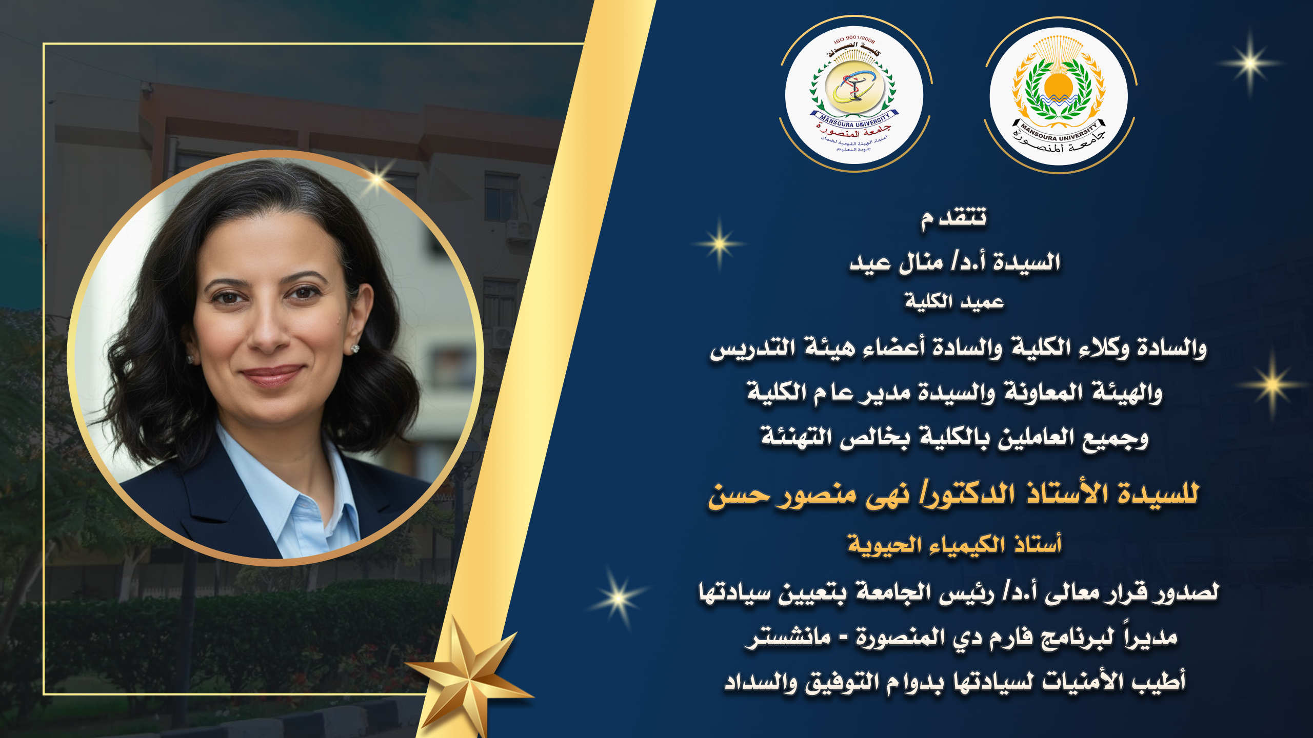 Previous Next 08 سبتمبر,2025 يارا محمد سليمان الزيارات: 361 أ.د/ نهى منصور مديراً لبرنامج فارم دى المنصورة - مانشستر تتقدم السيدة الأستاذ الدكتور/ منال عيد – عميد الكلية والسيد الأستاذ الدكتور/ خالد بشير – وكيل الكلية لشئون الدراسات العليا والبحوث والسيد الأستاذ الدكتور/ هانى قناوى – وكيل الكلية لشئون خدمة المجتمع وتنمية البيئة والسيدة الأستاذ الدكتور/ جينى جيهان نصر – وكيل الكلية لشئون التعليم والطلاب والسادة أعضاء هيئة التدريس والهيئة المعاونه والسيدة/ أمل عبد الجواد – مدير عام الكلية وجميع العاملين بالكلية بخالص التهنئة للسيدة الأستاذ الدكتور/ نهى منصور حسن – أستاذ الكيمياء الحيوية لصدور قرار معالى السيد الأستاذ الدكتور/ رئيس الجامعه بتعيين سيادتها مديراً لبرنامج فارم دى المنصورة - مانشستر. أطيب الأمنيات لسيادتها بدوام التوفيق والسداد السابق التالي