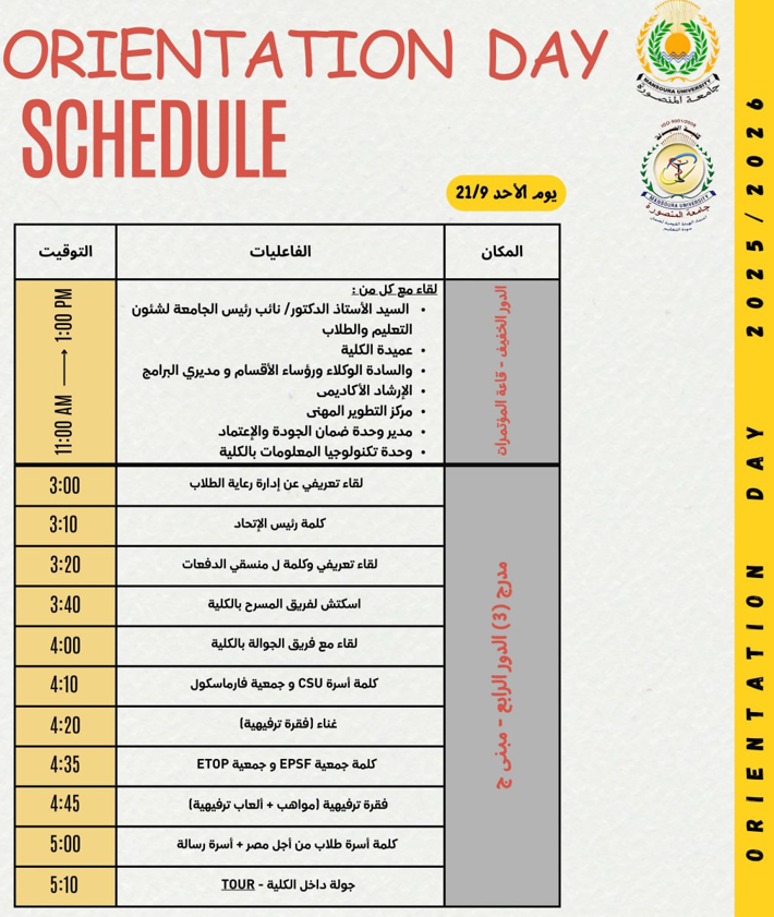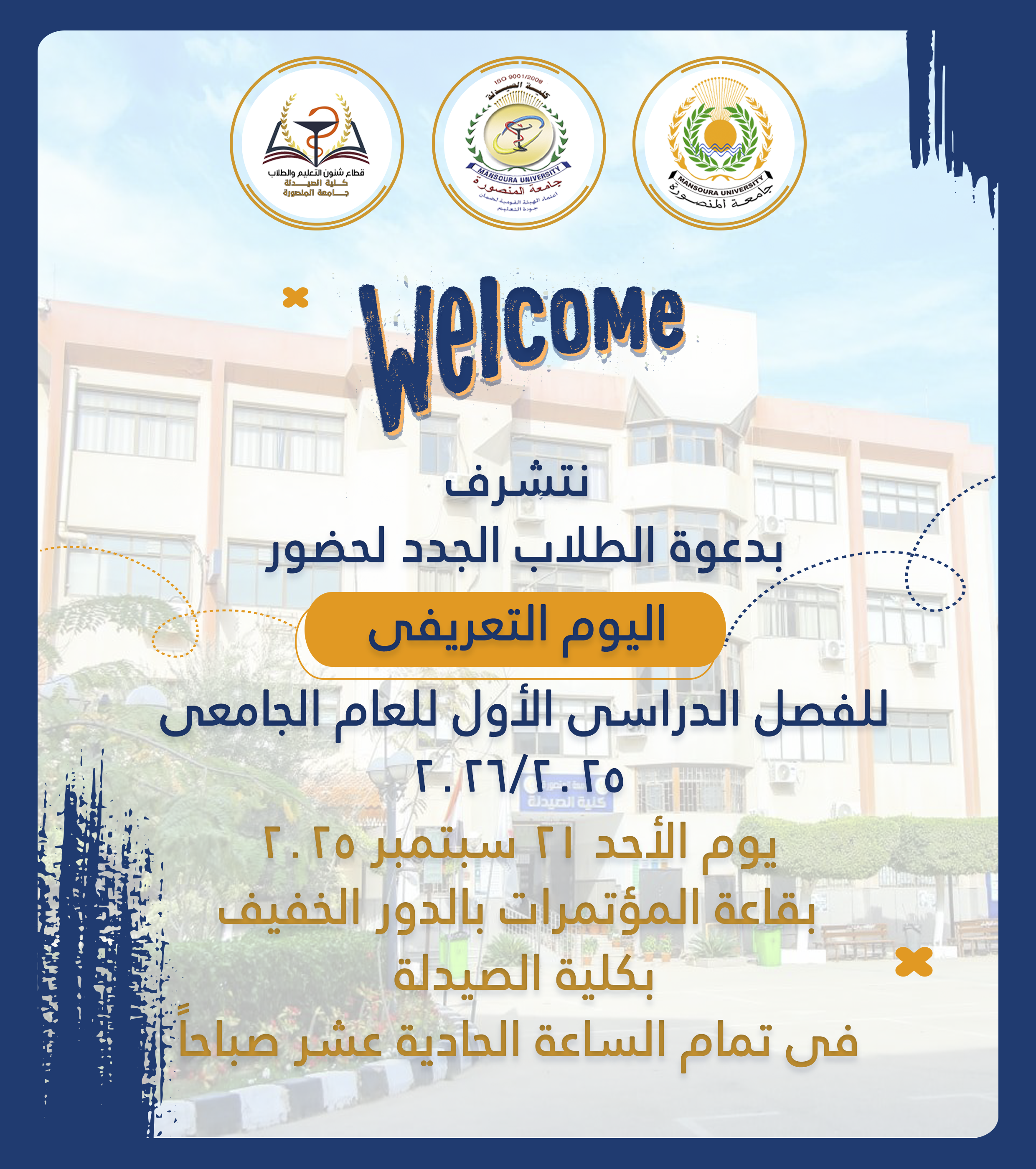 تتشرف إدارة كلية الصيدلة - جامعة المنصورة بدعوة الطلاب الجدد لحضور اللقاء التعريفى للفصل الدراسى الأول للعام الجامعى 2026/2025 وذلك يوم الأحد الموافق 21 سبتمبر 2025 بقاعة المؤتمرات بالدور الخفيف بكلية الصيدلة فى تمام الساعة الحادية عشر صباحاً .