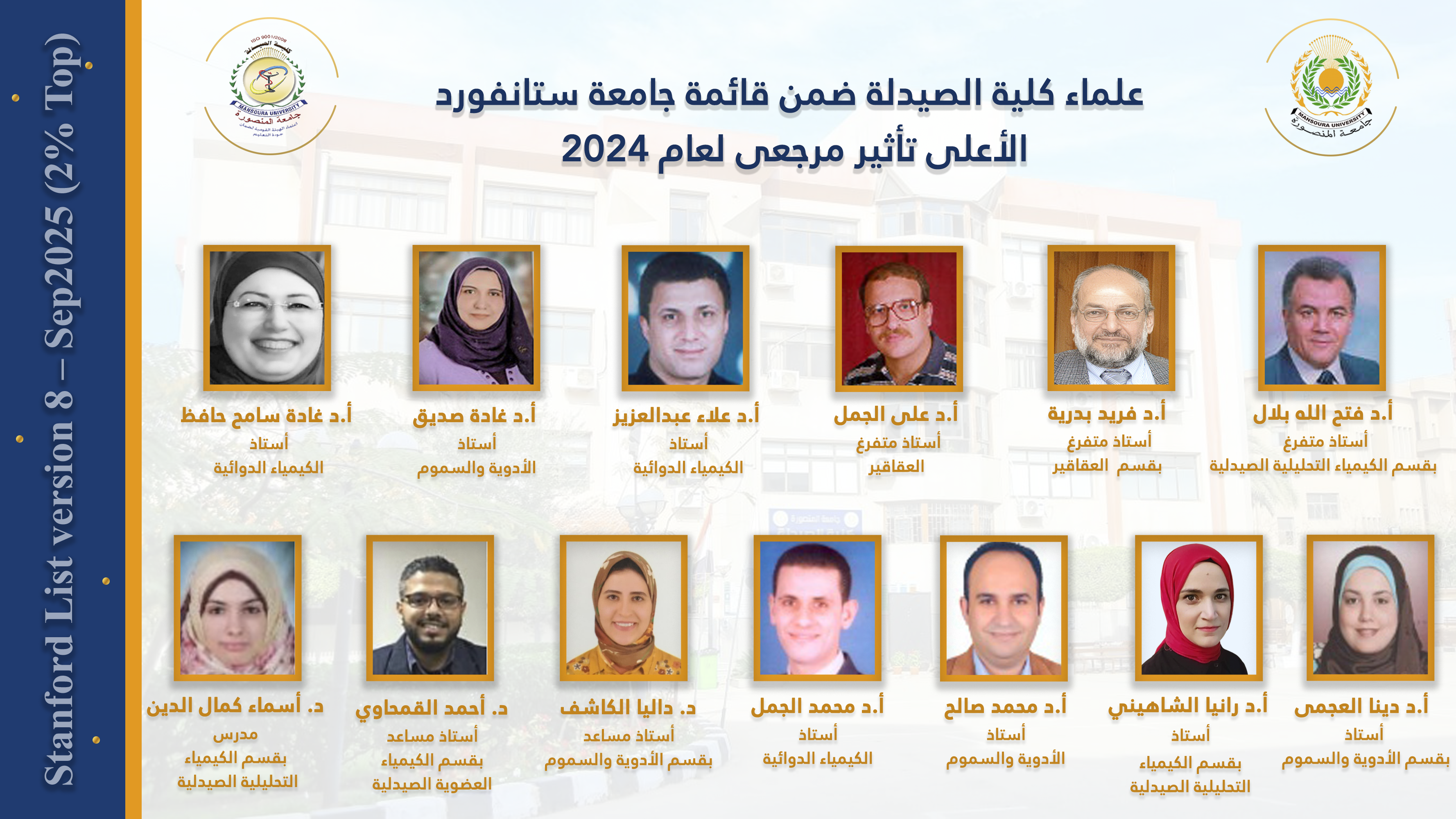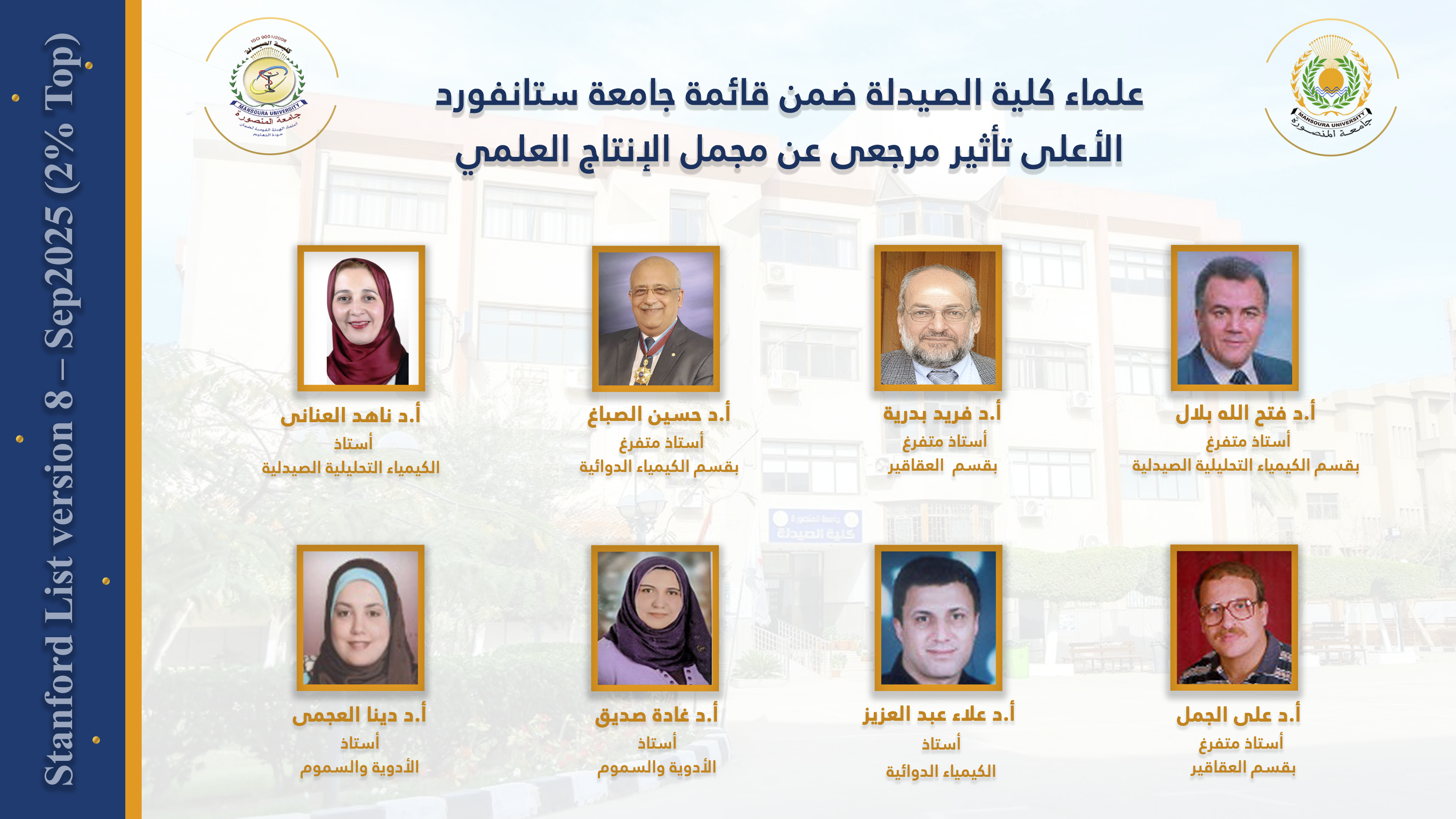 تتقدم السيدة الأستاذ الدكتور/ منال عيد - عميد الكلية والسيد الأستاذ الدكتور / خالد بشير - وكيل الكلية لشئون الدراسات العليا والبحوث والسيد الأستاذ الدكتور/ هانى قناوى - وكيل الكلية لشئون خدمة المجتمع وتنمية البيئة والسيدة الأستاذ الدكتور/ جينى جيهان نصر - وكيل الكلية لشئون التعليم والطلاب والسادة أعضاء هيئة التدريس والهيئة المعاونه والسيدة/ أمل عبد الجواد - مدير عام الكلية وجميع العاملين بالكلية بخالص التهنئة للسادة علماء الكلية لحصولهم على ترتيب أفضل 2% من العلماء على مستوى العالم الأكثر تأثيراً مرجعياً عن مجمل الإنتاج العلمي و تأثيراً مرجعياً عن الانتاج العلمي لعام 2024 ضمن قائمة ستانفورد الصادرة عن قاعدة بيانات Elsevier .
