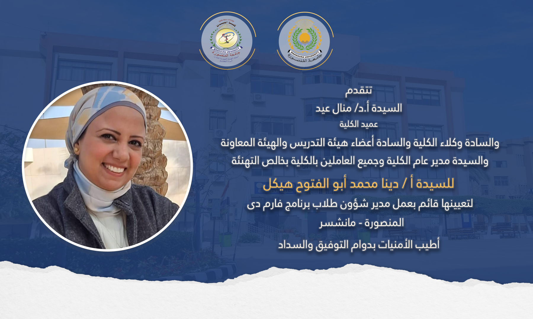 تتقدم السيدة الأستاذ الدكتور/ منال عيد – عميد الكلية والسيد الأستاذ الدكتور/ خالد بشير – وكيل الكلية لشئون الدراسات العليا والبحوث والسيد الأستاذ الدكتور/ هانى قناوي – وكيل الكلية لشئون خدمة المجتمع وتنمية البيئة والسيدة الأستاذ الدكتور/ جينى جيهان نصر – وكيل الكلية لشئون التعليم والطلاب والسادة أعضاء هيئة التدريس والهيئة المعاونة والسيدة/ أمل عبد الجواد – مدير عام الكلية وجميع العاملين بالكلية بخالص التهنئة للسيدة أ/ دينا محمد أبو الفتوح هيكل وذلك لتعيينها قائم بعمل مدير شؤون طلاب برنامج فارم دى المنصورة - مانشستر