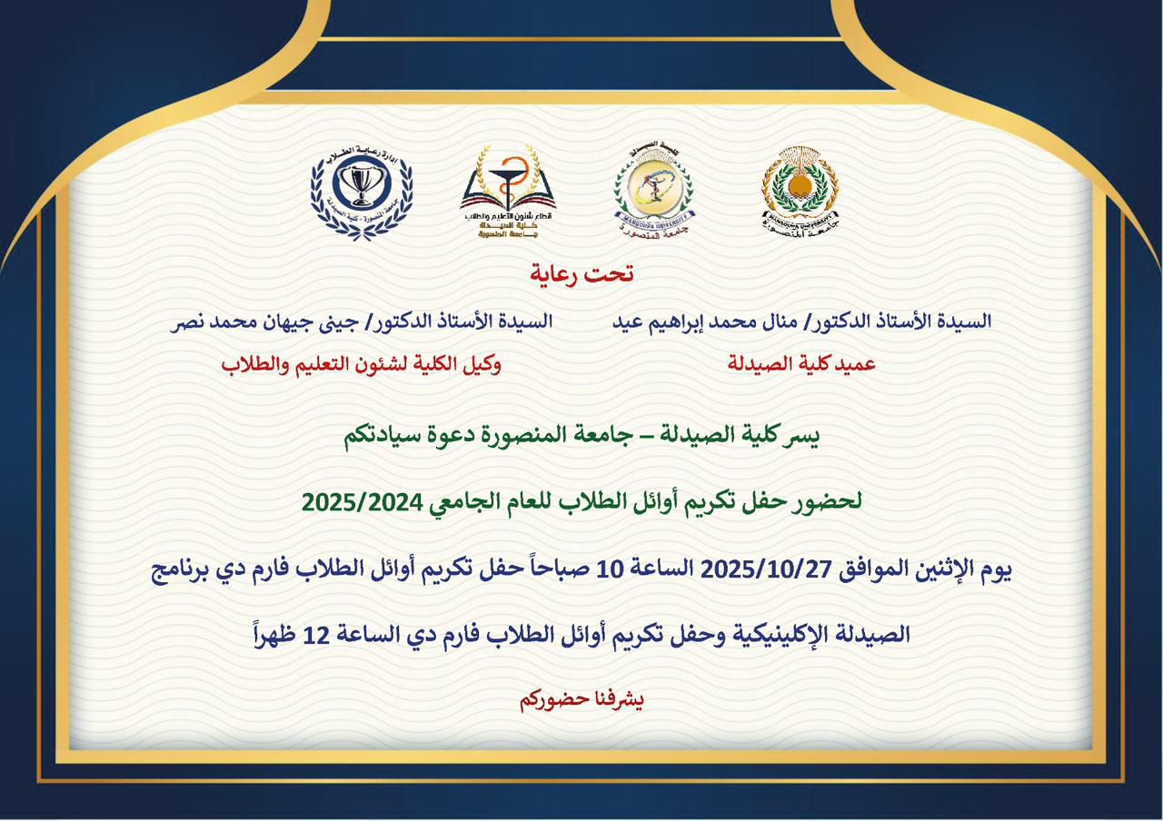 تتشرف كلية الصيدلة – جامعة المنصورة بدعوة سيادتكم لحضور حفل تكريم أوائل الطلاب للعام الجامعي 2024 / 2025