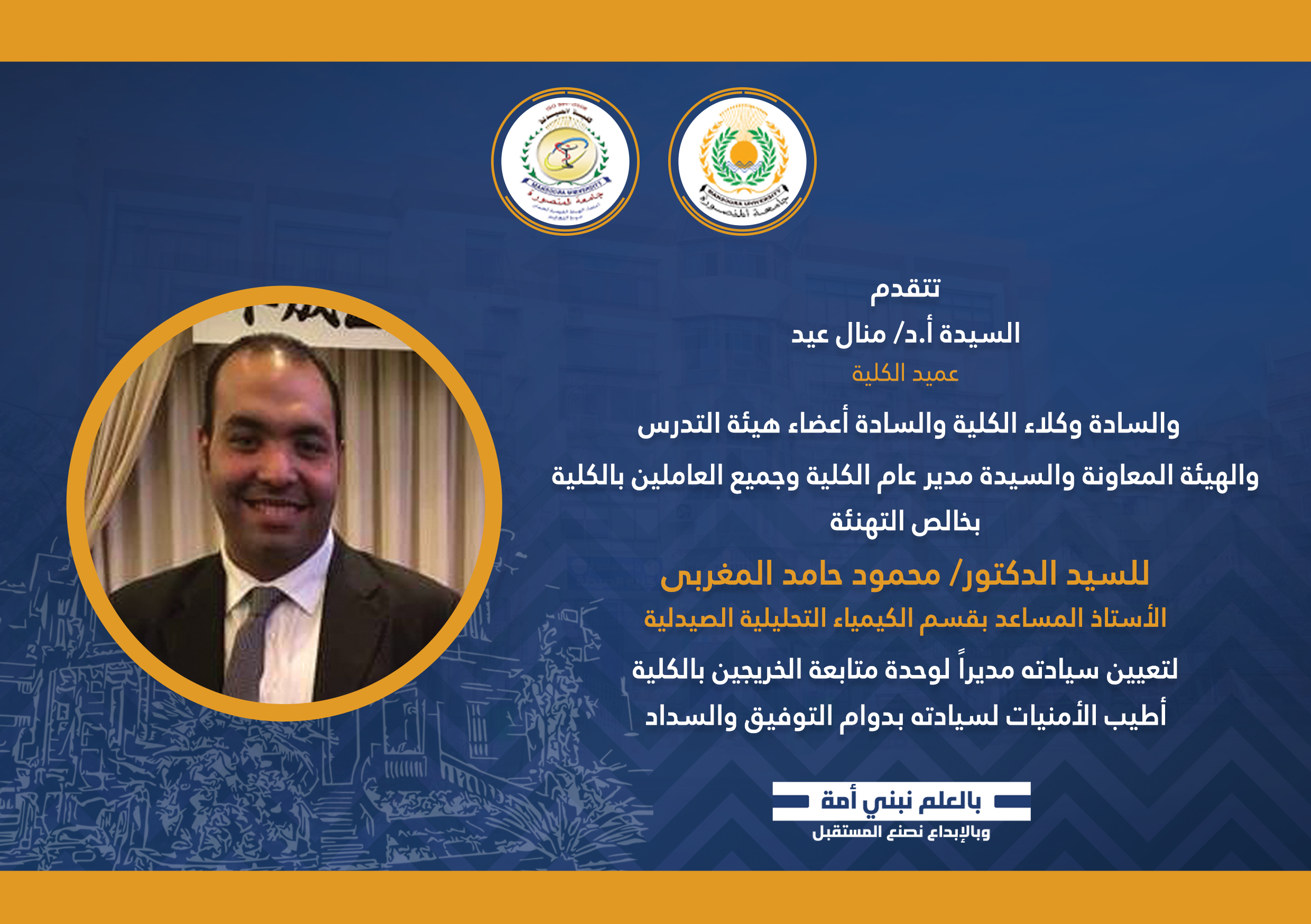 Previous Next 30 أكتوبر,2025 يارا محمد سليمان الزيارات: 261 تهنئة تتقدم السيدة الأستاذ الدكتور/ منال عيد – عميد الكلية والسيد الأستاذ الدكتور/ خالد بشير – وكيل الكلية لشئون الدراسات العليا والبحوث والسيد الأستاذ الدكتور/ هانى قناوى – وكيل الكلية لشئون خدمة المجتمع وتنمية البيئة والسيدة الأستاذ الدكتور/ جينى جيهان نصر – وكيل الكلية لشئون التعليم والطلاب والسادة أعضاء هيئة التدريس والهيئة المعاونه والسيدة/ أمل عبد الجواد – مدير عام الكلية وجميع العاملين بالكلية بخالص التهنئة للسيد الدكتور/ محمود حامد المغربى – الأستاذ المساعد بقسم الكيمياء التحليلية الصيدلية لتعيين سيادته مديراً لوحدة متابعة الخريجين بكلية الصيدلة. أطيب الأمنيات لسيادته بدوام التوفيق والسداد السابق التالي