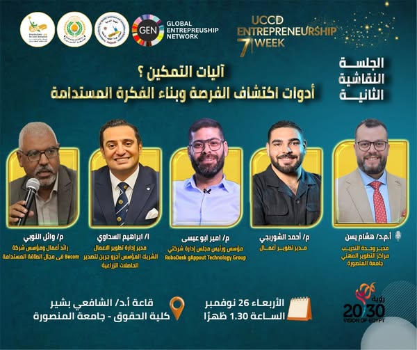 استعدوا للجلسة النقاشية الثانية في أسبوع ريادة الأعمال السابع لمراكز التطوير المهني بجامعة المنصورة!