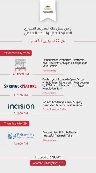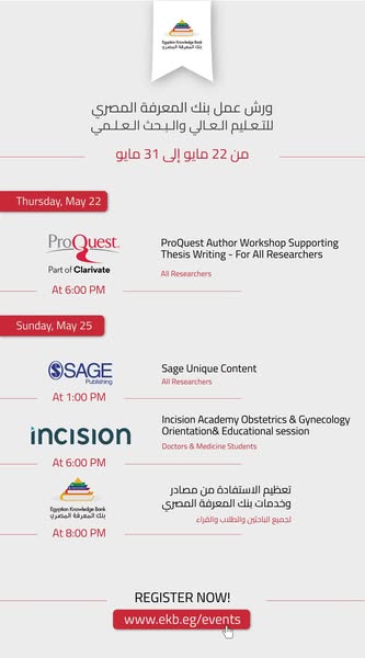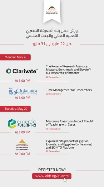 الجدول الاسبوعي لورش عمل Egyptian Knowledge Bank- EKB الأونلاين للفترة من 22 مايو إلى 31 مايو.