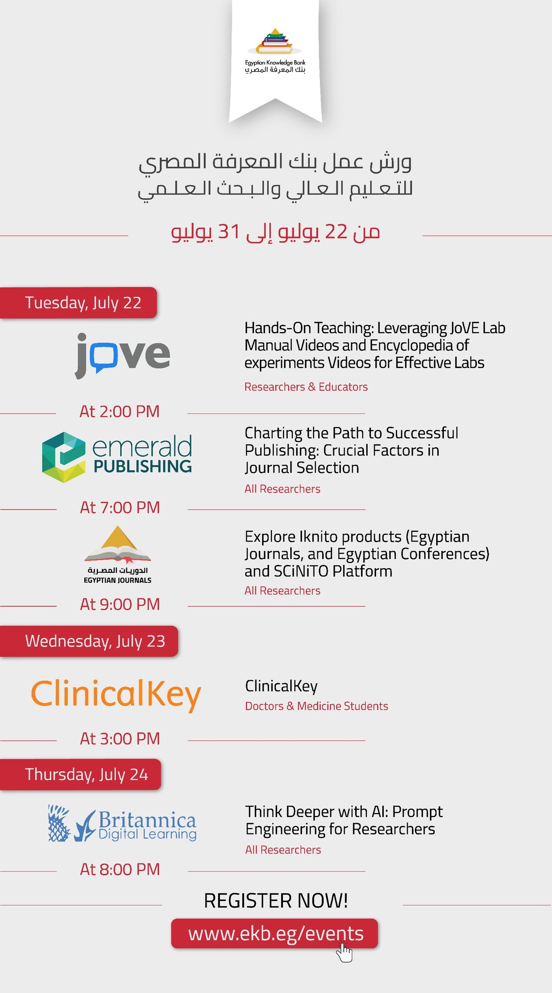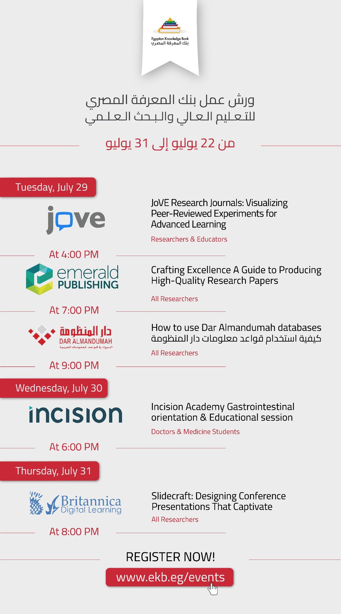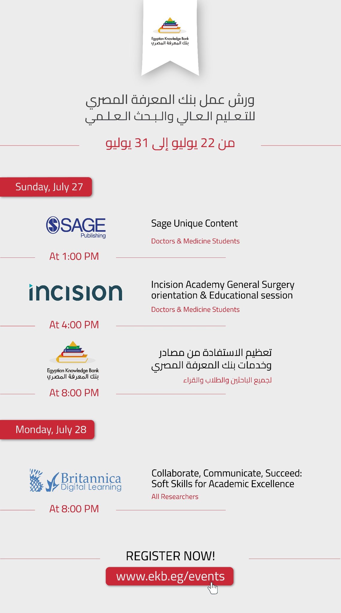 للطلاب الجامعيين والباحثين وأعضاء هيئة التدريس، تعرف على الجدول الاسبوعي لورش عمل بنك المعرفة المصري المجانية الأونلاين للفترة من 22 يوليو إلى 31 يوليو.