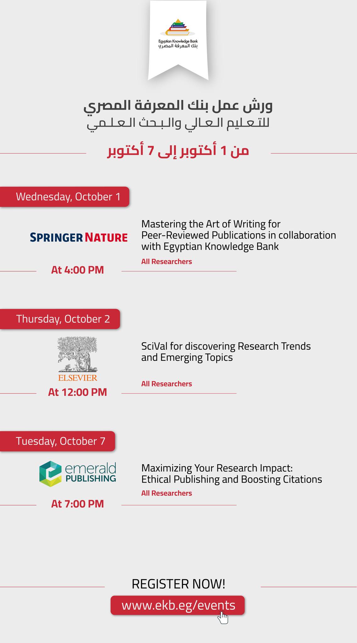 للطلاب الجامعيين والباحثين وأعضاء هيئة التدريس، تعرف على الجدول الاسبوعي لورش عمل بنك المعرفة المصري المجانية الأونلاين للفترة من 1 أكتوبر إلى 7 أكتوبر. رابط جميع ورش عمل بنك المعرفة المصري: https://www.ekb.eg/ar/events