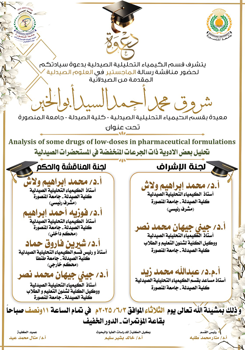 يارا محمد سليمان الزيارات: 162 مناقشة رسالة الماجستير فى العلوم الصيدلية المقدمة من الصيدلانية/ شروق محمد أحمد السيد أبو الخير السابق التالي
