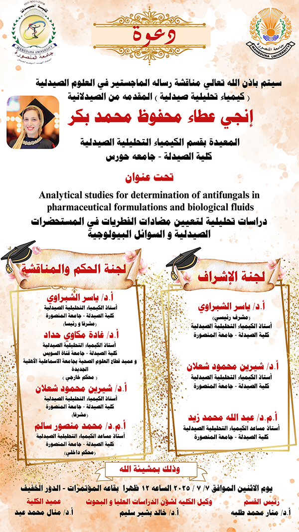 يارا محمد سليمان الزيارات: 92 مناقشة رسالة الماجستير فى العلوم الصيدلية (كيمياء تحليلية صيدلية) المقدمة من الصيدلانية/ إنجى عطاء محفوظ محمد بكر السابق التالي