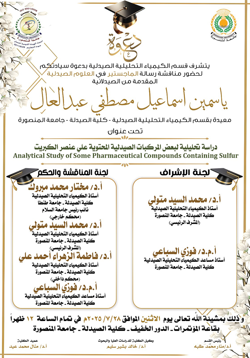 يارا محمد سليمان الزيارات: 115 مناقشة رسالة الماجستير فى العلوم الصيدلية المقدمة من الصيدلانية/ ياسمين اسماعيل مصطفى عبد العال السابق التالي