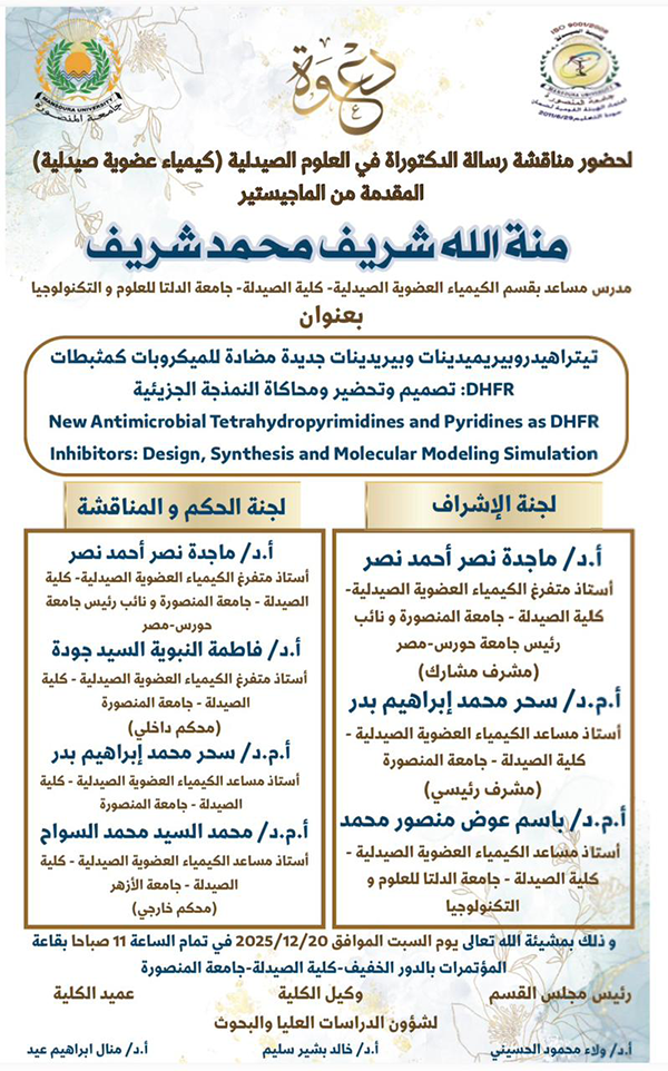 يارا محمد سليمان الزيارات: 38 مناقشة رسالة الدكتواره فى العلوم الصيدلية ( كيمياء عضوية صيدلية) المقدمة من الماجستير / منه الله شريف محمد شريف السابق التالي