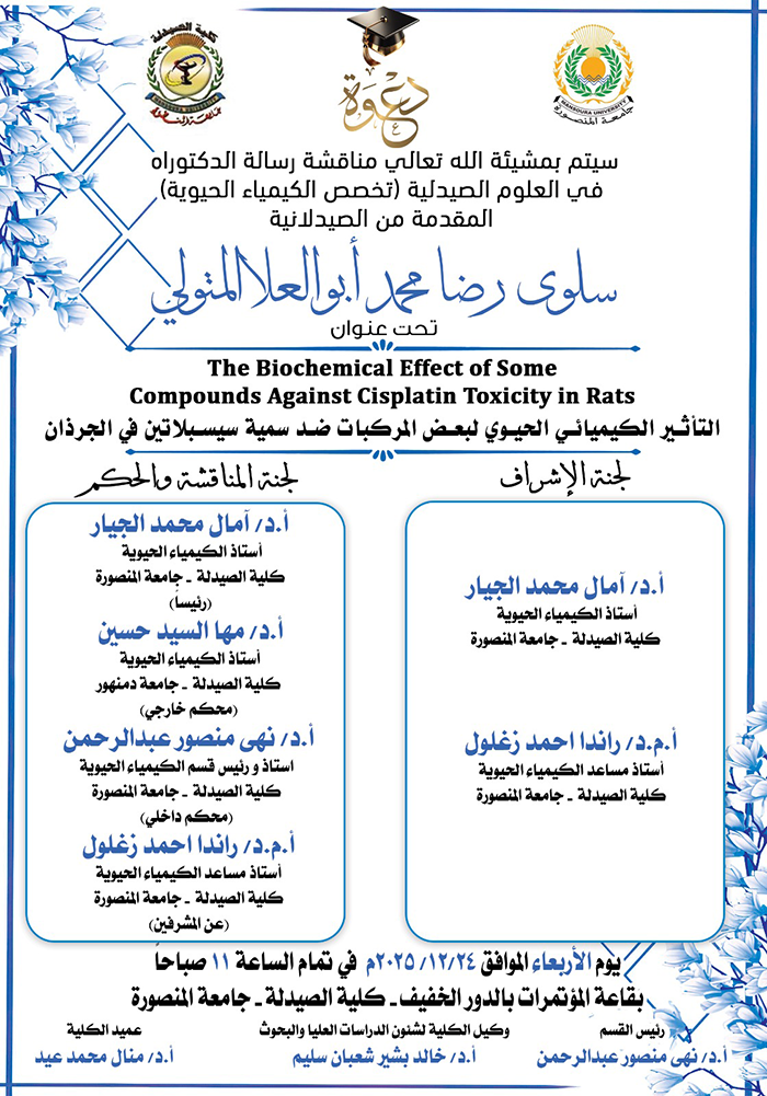 يارا محمد سليمان الزيارات: 38 مناقشة رسالة الدكتواره فى العلوم الصيدلية (تخصص كيمياء حيوية) المقدمة من الصيدلانية / سلوى رضا محمد ابو العلا المتولى السابق التالي