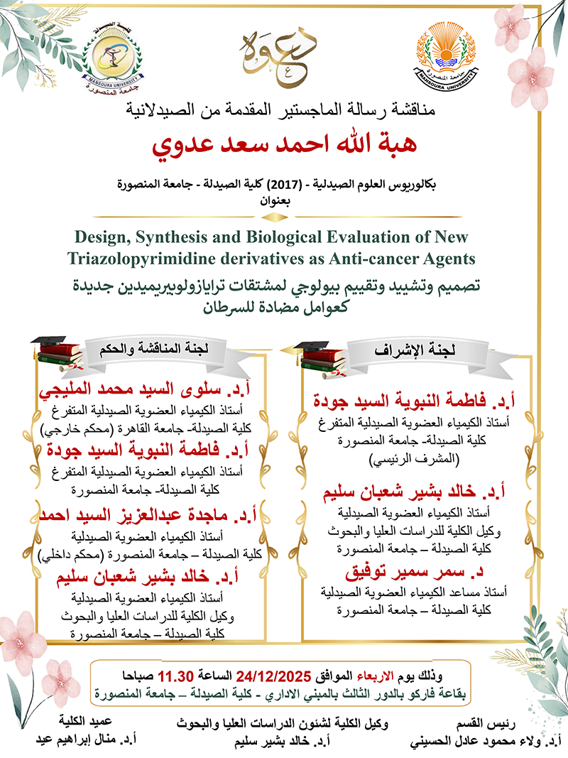يارا محمد سليمان الزيارات: 24 مناقشة رسالة الماجستير المقدمة من الصيدلانية / هبة الله احمد سعد عدوى السابق التالي