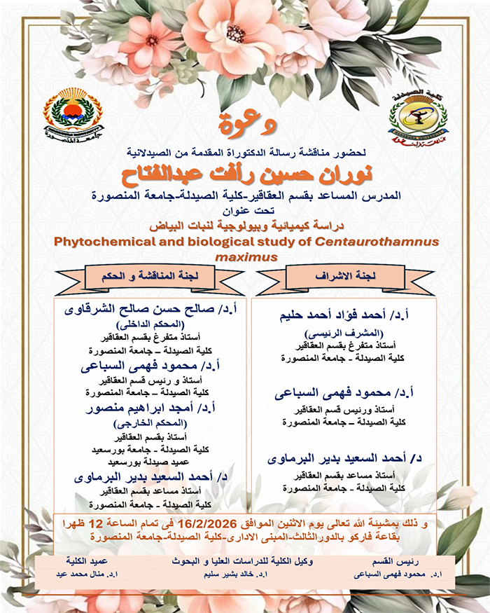 يارا محمد سليمان الزيارات: 18 مناقشة رسالة الدكتوراه المقدمة من الصيدلانية/ نوران حسين رأفت عبدالفتاح السابق التالي