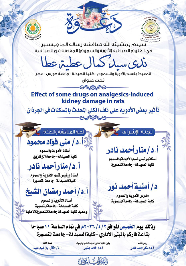 يارا محمد سليمان الزيارات: 9 مناقشة رسالة الماجستير فى العلوم الصيدلية (الأدوية والسموم) المقدمة من الصيدلانية / ندى سيد كمال عطية عطا السابق التالي