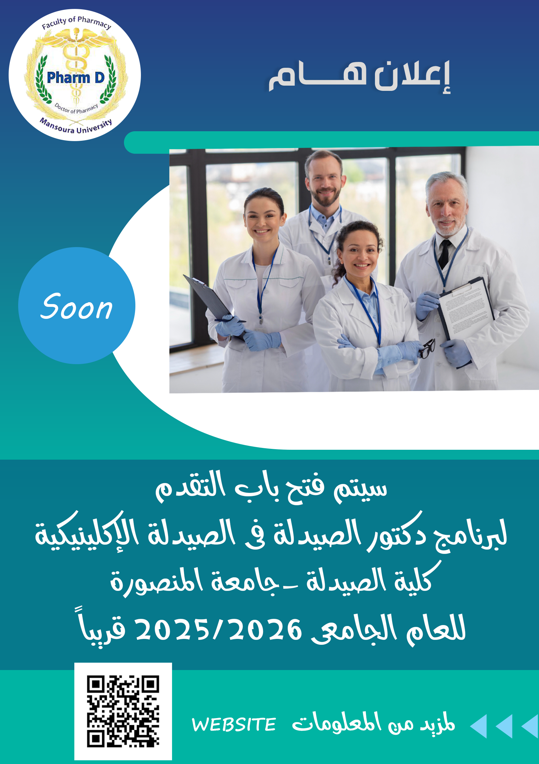 Previous Next يارا محمد سليمان الزيارات: 175 إعلان هـــام سيتم فتح باب التقدم لبرنامج "دكتور الصيدلة فى الصيدلة الإكلينيكية Pharm D" للعام الجامعي ٢٠٢٦/٢٠٢٥ قريباً لمزيد من المعلومات الموقع الرسمى للكلية: https://pharfac.mans.edu.eg/index.php/pharm-d السابق التالي