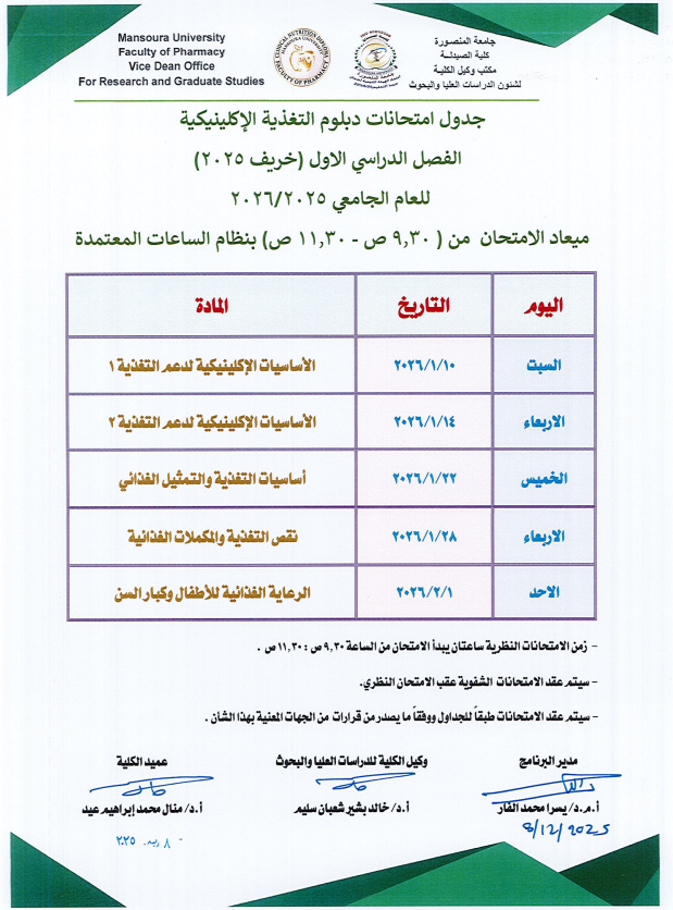 يارا محمد سليمان الزيارات: 5 جدول امتحانات دبلوم التغذية الإكلينيكية الفصل الدراسي الأول خريف (2025) للعام الجامعي 2026/2025 (لائحة قديمة ) التالي