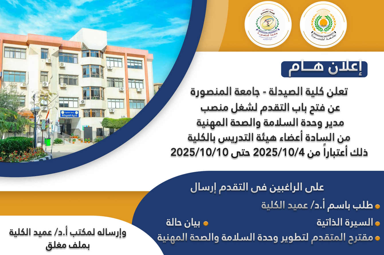 تعلن كلية الصيدلة - جامعة المنصورة عن فتح باب التقدم لشغل منصب مدير وحدة السلامة والصحة المهنية من السادة أعضاء هيئة التدريس بالكلية ، على أن يتقدم الراغيبين لشغل هذا المنصب بطلب بأسم أ.د/ عميد الكلية مرفقاً بالسيرة الذاتية وبيان حالة ومقترح المتقدم لتطوير وحدة السلامة والصحة المهنية.
