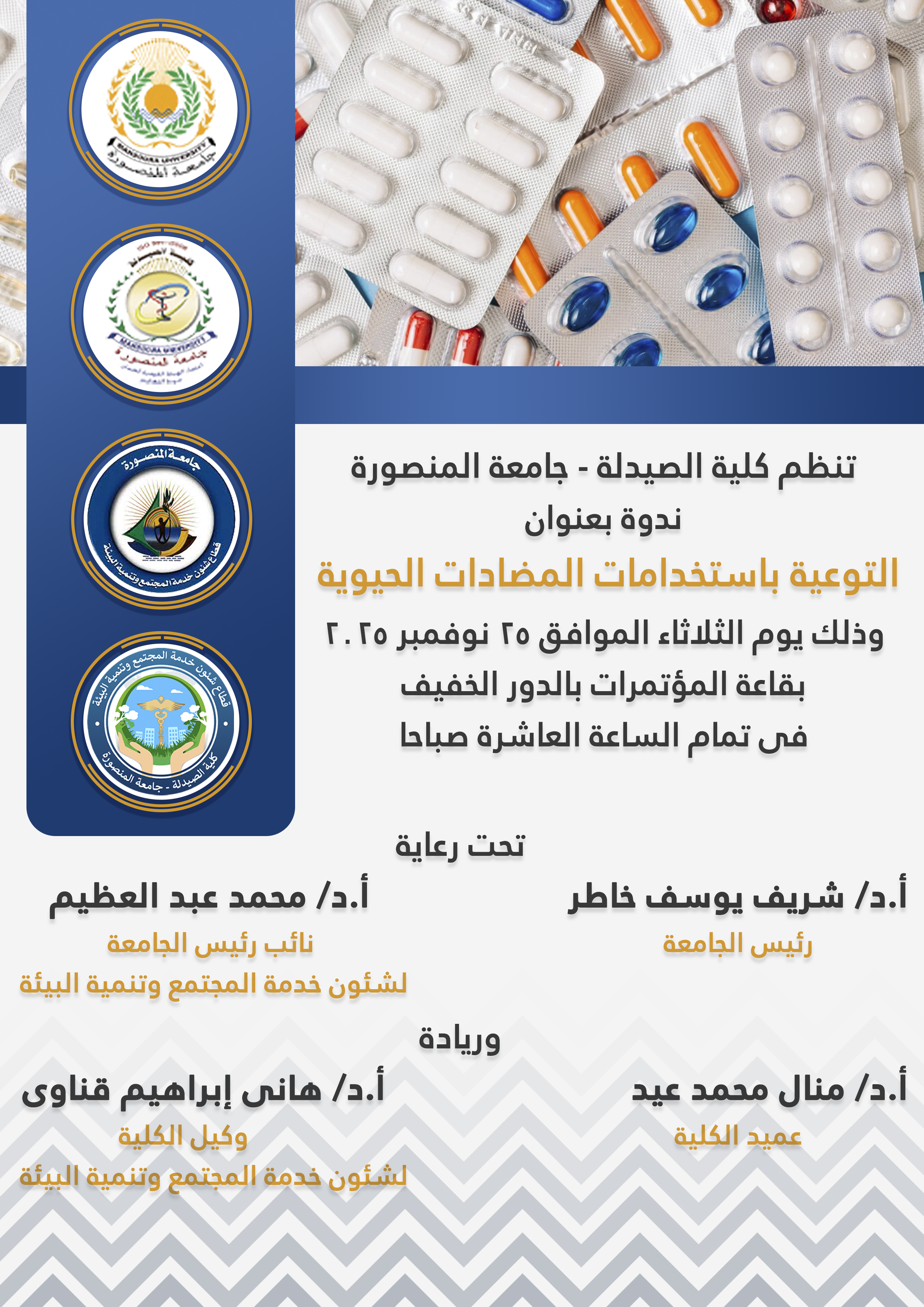 تتشرف كلية الصيدلة – جامعة المنصورة بدعوة سيادتكم لحضور ندوة تحت عنوان "التوعية باستخدام المضادات الحيوية" يوم الثلاثاء الموافق 25 نوفمبر 2025 في تمام الساعة العاشرة صباحاً بقاعة المؤتمرات بالدور الخفيف بالكلية ،وذلك تحت رعاية السيد الأستاذ الدكتور/ شريف خاطر –رئيس الجامعة والسيد الأستاذ الدكتور/ محمد عبد العظيم – نائب رئيس الجامعة لشئون خدمة المجتمع وتنمية البيئة وريادة السيدة الأستاذ الدكتور/ منال عيد – عميد الكلية والسيد الأستاذ الدكتور/ هانى قناوى – وكيل الكلية لشئون خدمة المجتمع وتنمية البيئة .