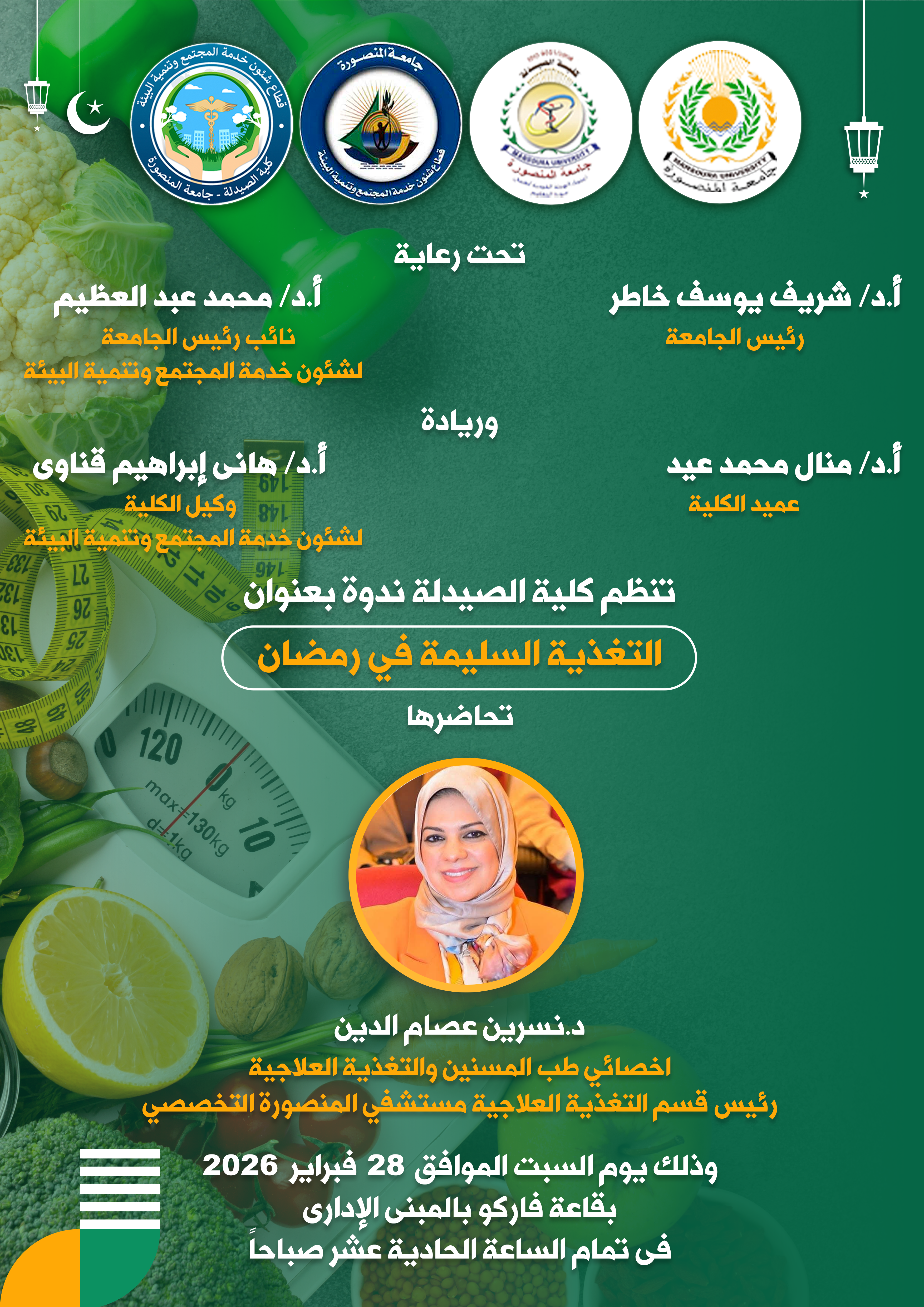 تتشرف إدارة كلية الصيدلة – جامعة المنصورة بدعوة سيادتكم لحضور ندوة تحت عنوان " التغذية السليمة في رمضان " وذلك يوم السبت الموافق 28 فبراير 2026 بقاعة فاركو بالمبنى الإدارى بالكلية فى تمام الساعة الحادية عشر صباحاً تحاضرها السيدة الدكتور/ نسرين عصام الدين – اخصائي طب المسنين والتغذية العلاجية ورئيس قسم التغذية العلاجية مستشفي المنصورة التخصصي.