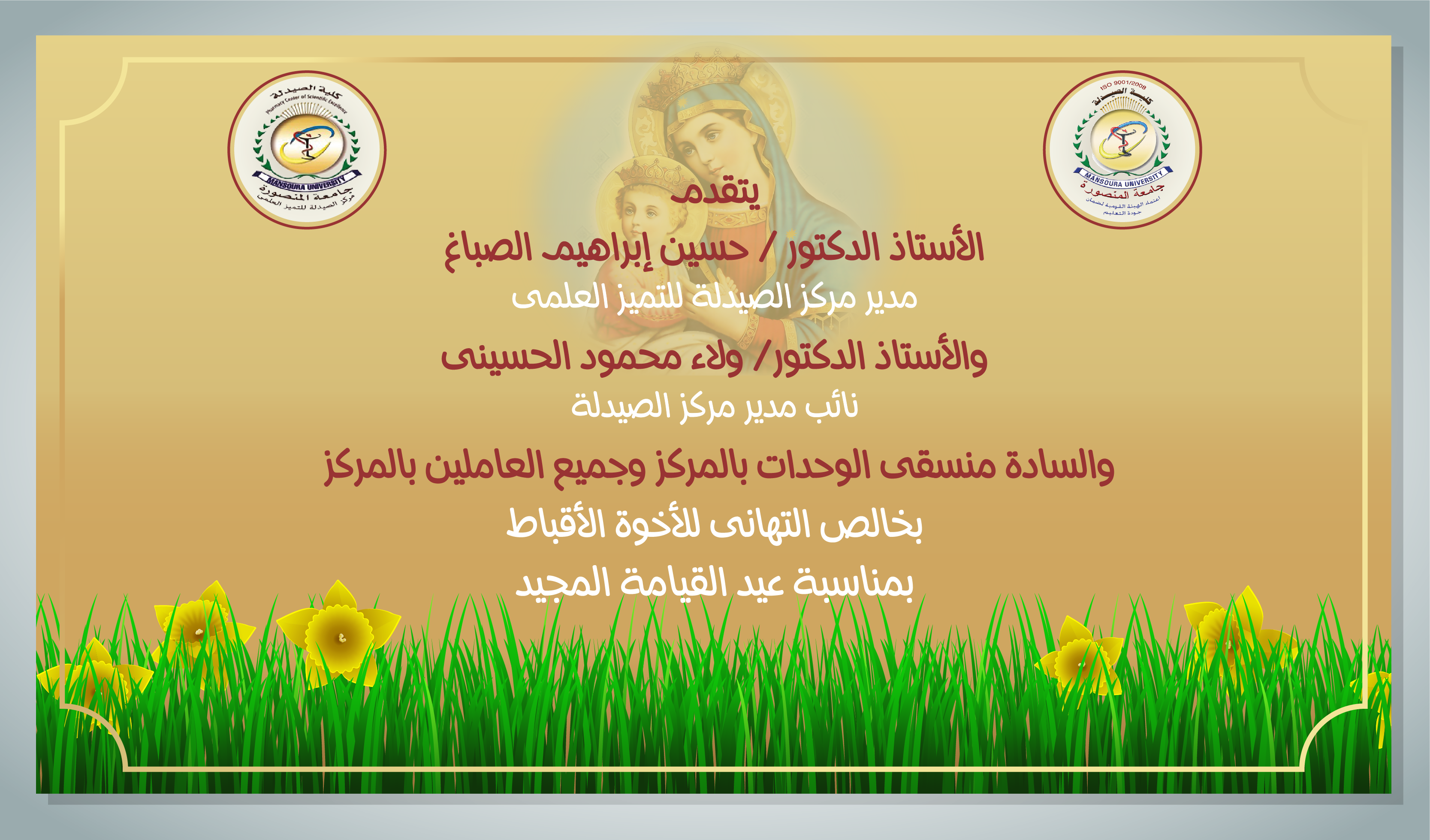 يتقدم الأستاذ الدكتور/ حسين إبراهيم الصباغ – مدير مركز الصيدلة للتميز العلمى والأستاذ الدكتور/ ولاء محمود الحسينى – نائب مدير مركز الصيدلة للتميز العلمى بخالص التهاني للأخوة الأقباط بمناسبة عيد القيامة المجيد.