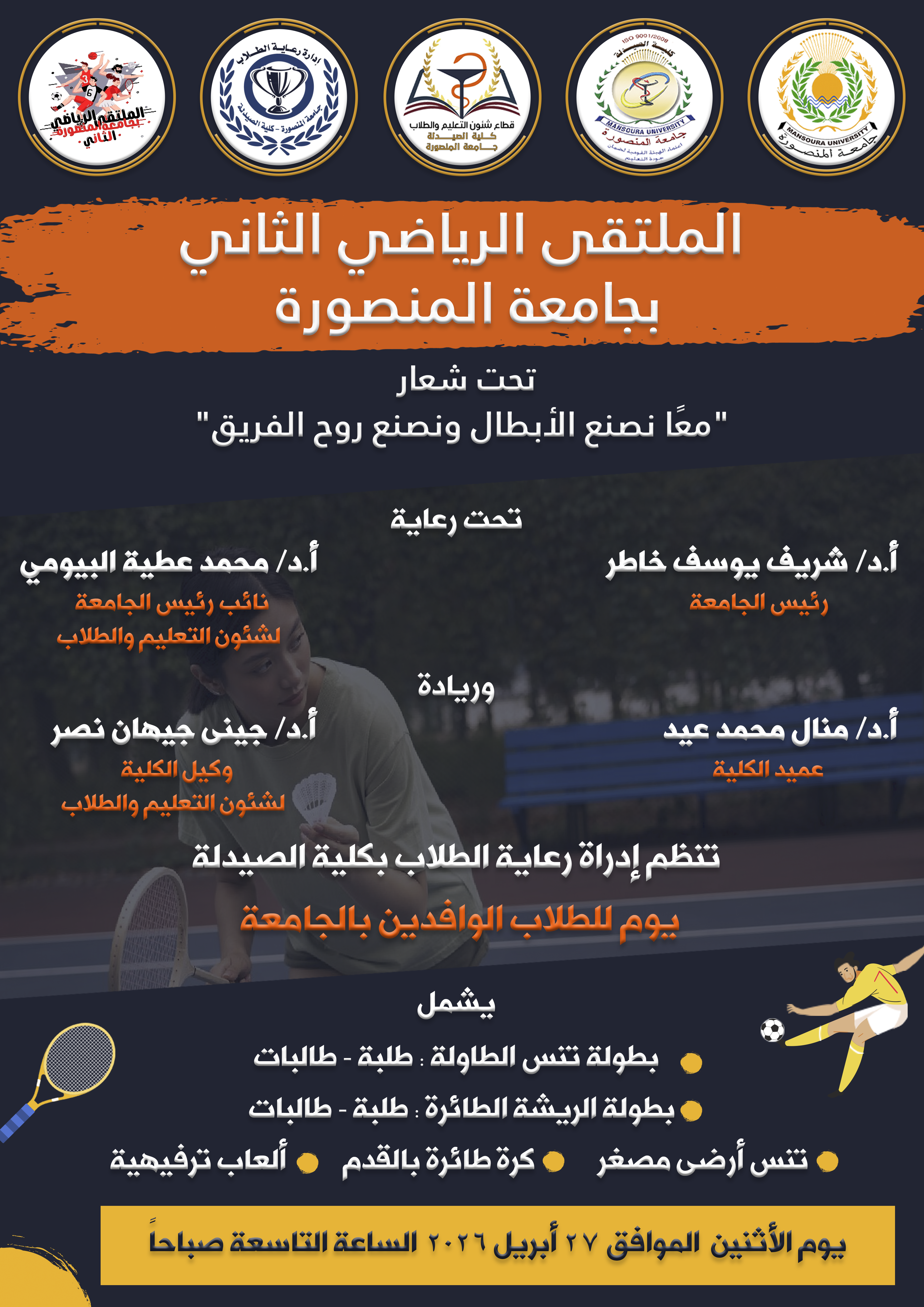 تتشرف إدارة رعاية الطلاب بكلية الصيدلة بدعوتكم للمشاركة فى فعاليات الملتقى الرياضى الثانى بجامعة المنصورة تحت شعار "معًا نصنع الأبطال ونصنع روح الفريق" ،وذلك يوم الإثنين الموافق 27 أبريل 2026 وذلك بساحة كلية الصيدلة فى تمام الساعة التاسعة صباحًا .