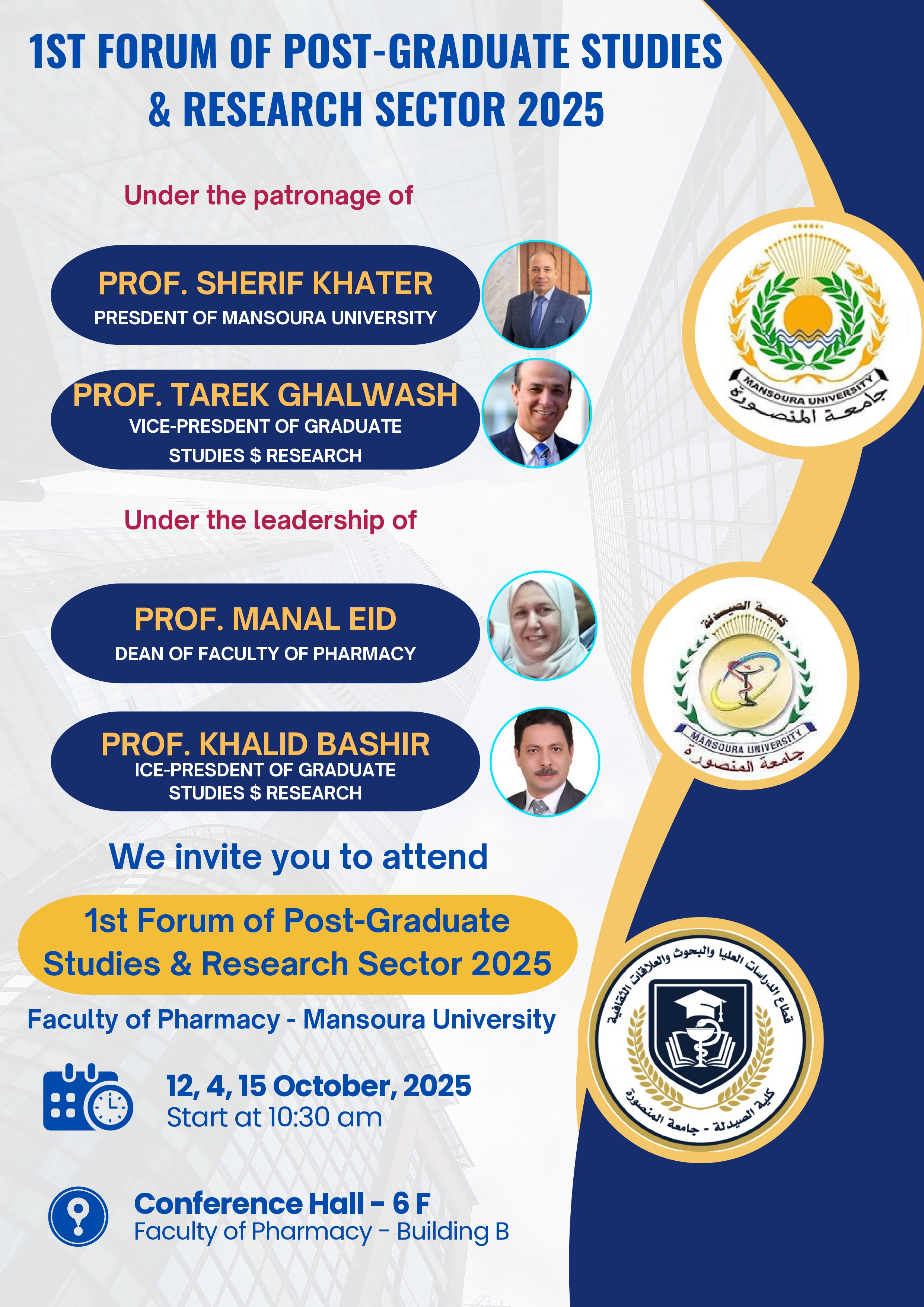 تحت رعاية السيد الأستاذ الدكتور/ شريف خاطر – رئيس جامعة المنصورة والسيد الأستاذ الدكتور/ طارق غلوش – نائب رئيس جامعة المنصورة لشئون الدراسات العليا والبحوث وريادة السيدة الأستاذ الدكتور/ منال عيد – عميد الكلية والسيد الأستاذ الدكتور/ خالد بشير – وكيل الكلية لشئون الدراسات العليا والبحوث ، سيتم عقد الملتقى الأول لقطاع الدراسات العليا والبحوث بكلية الصيدلة (المؤتمرات العلمية السنوية للأقسام 2025/2024) يوم الأحد والثلاثاء والأربعاء 15،14،12 أكتوبر 2025 بقاعة المؤتمرات بالدور الخفيف بالكلية فى تمام الساعة العاشرة والنصف صباحاً.