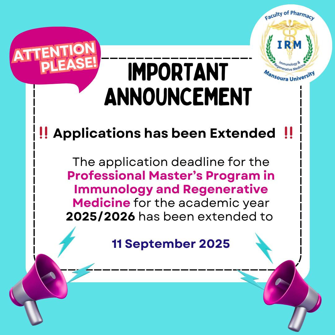 تعلن كلية الصيدلة جامعه المنصورة عن مد فترة التقديم ببرنامج الماجستير المهني في المناعة و الطب التجددي حتى يوم 11 سبتمبر 2025