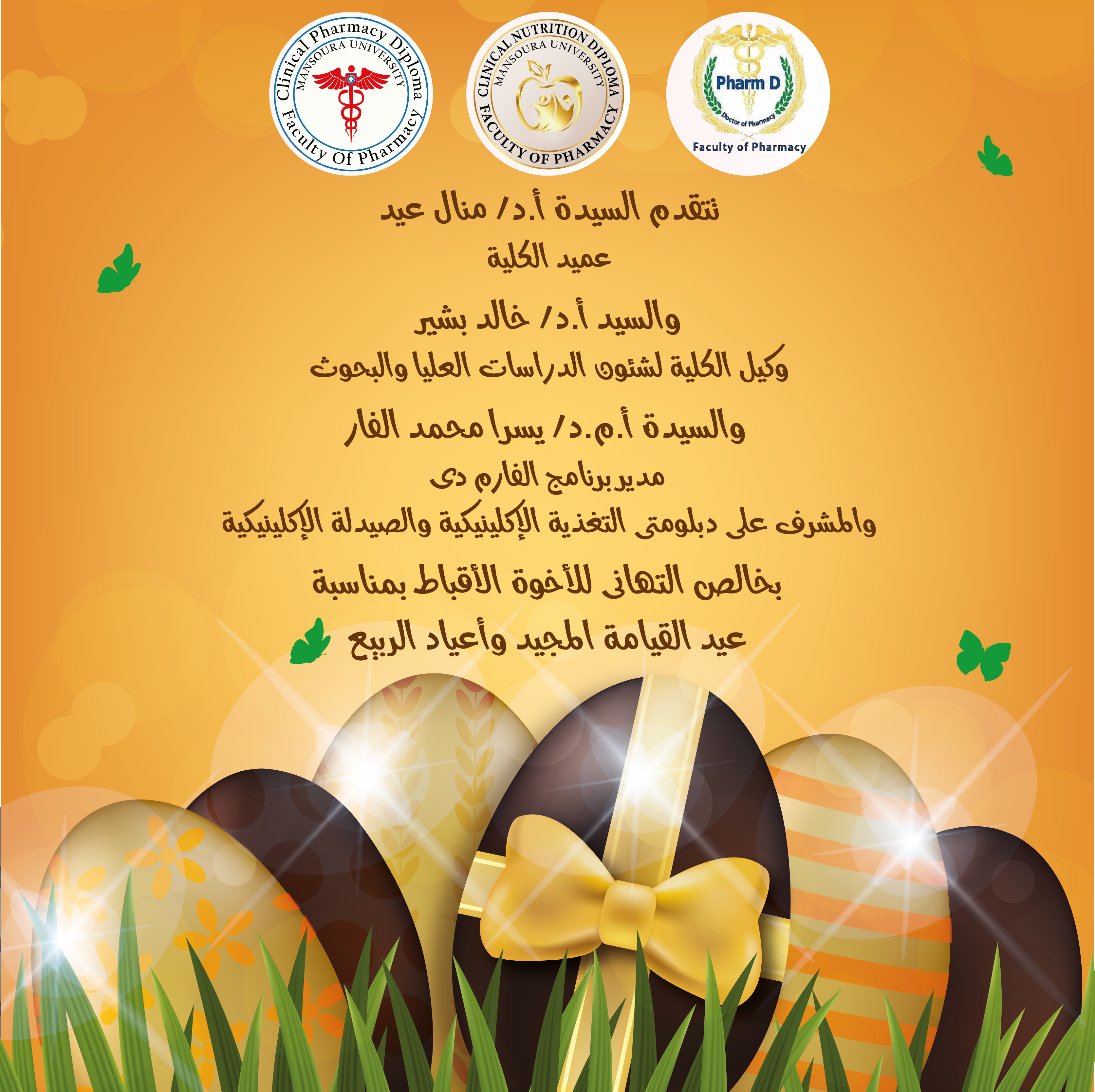 تتقدم السيدة الأستاذ الدكتور/ منال عيد – عميد الكلية والسيد الأستاذ الدكتور/ خالد بشير – وكيل الكلية لشئون الدراسات العليا والبحوث والسيدة الأستاذ المساعد الدكتور/ يسرا محمد الفار – مدير برنامج الفارم دى والمشرف على دبلومتى التغذية الإكلينيكية والصيدلة الإكلينيكية بخالص التهاني للأخوة الأقباط بمناسبة عيد القيامة المجيد وأعياد الربيع.