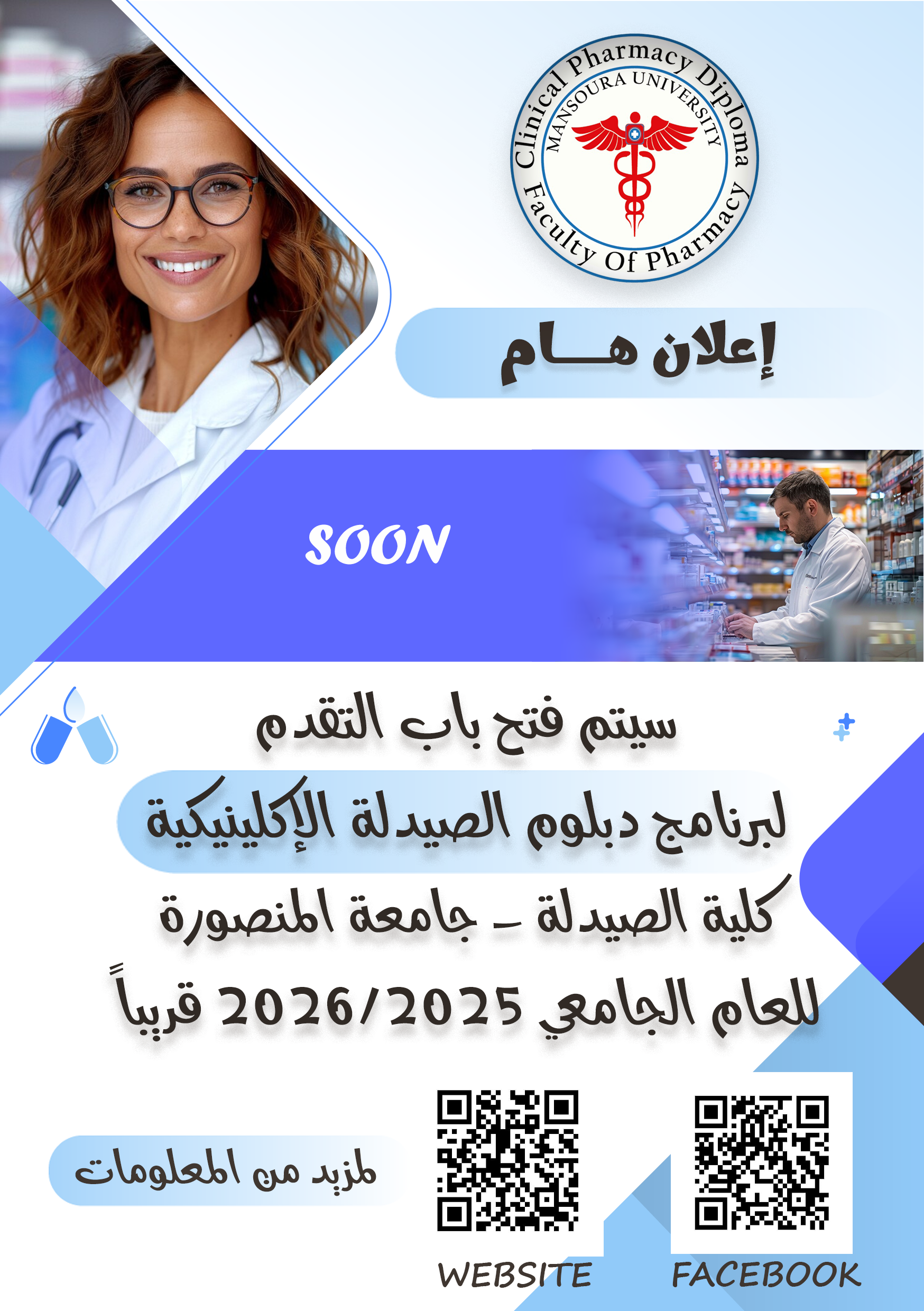 سيتم فتح باب التقدم لبرنامج "دبلوم الصيدلة الإكلينيكية" للعام الجامعي ٢٠٢٦/٢٠٢٥ قريباً