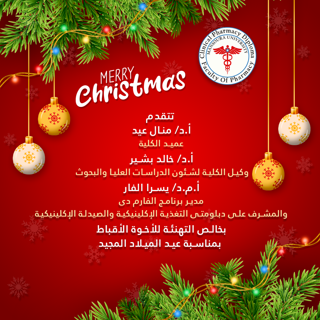 تتقدم السيدة الأستاذ الدكتور / منال عيد – عميد الكلية والسيد الأستاذ الدكتور / خالد بشير – وكيل الكلية لشئون الدراسات العليا والبحوث والسيدة الأستاذ المساعد الدكتور/ يسرا محمد الفار – مدير برنامج الفارم دى والمشرف على دبلومتى الصيدلة الإكلينيكية والتغذية الإكلينيكية بالتهنئة للأخوة الأقباط بعيد الميلاد المجيد .