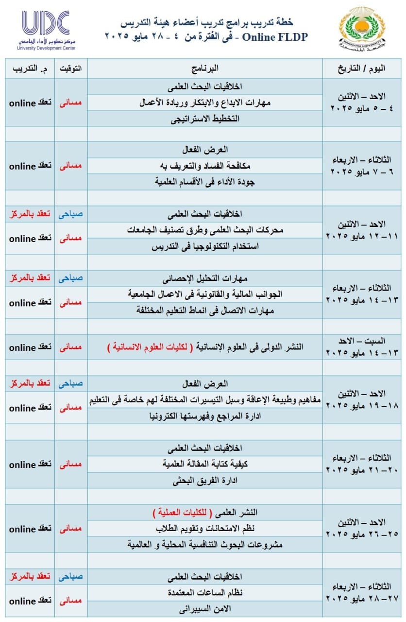 خطة تدريب برامج تدريب السادة أعضاء هيئة التدريس والباحثين فى الفترة من ٤ حتى ٢٨ مايو ٢٠٢٥