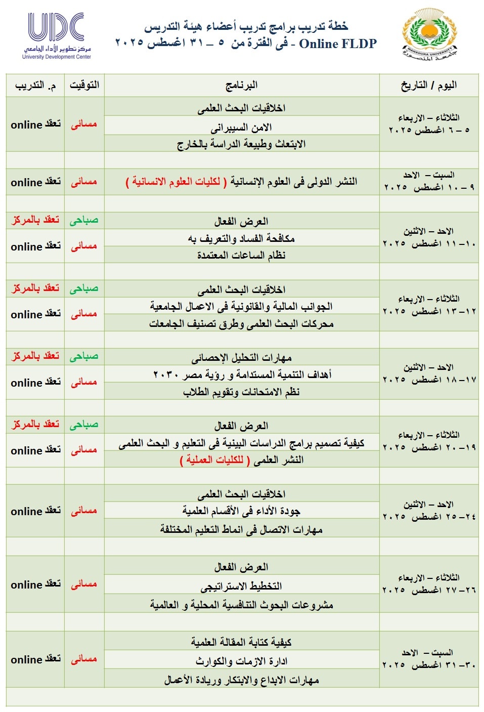 خطة تدريب برامج تدريب السادة أعضاء هيئة التدريس و السادة الباحثين فى الفترة من ٥ حتى ٣١ أغسطس ٢٠٢٥